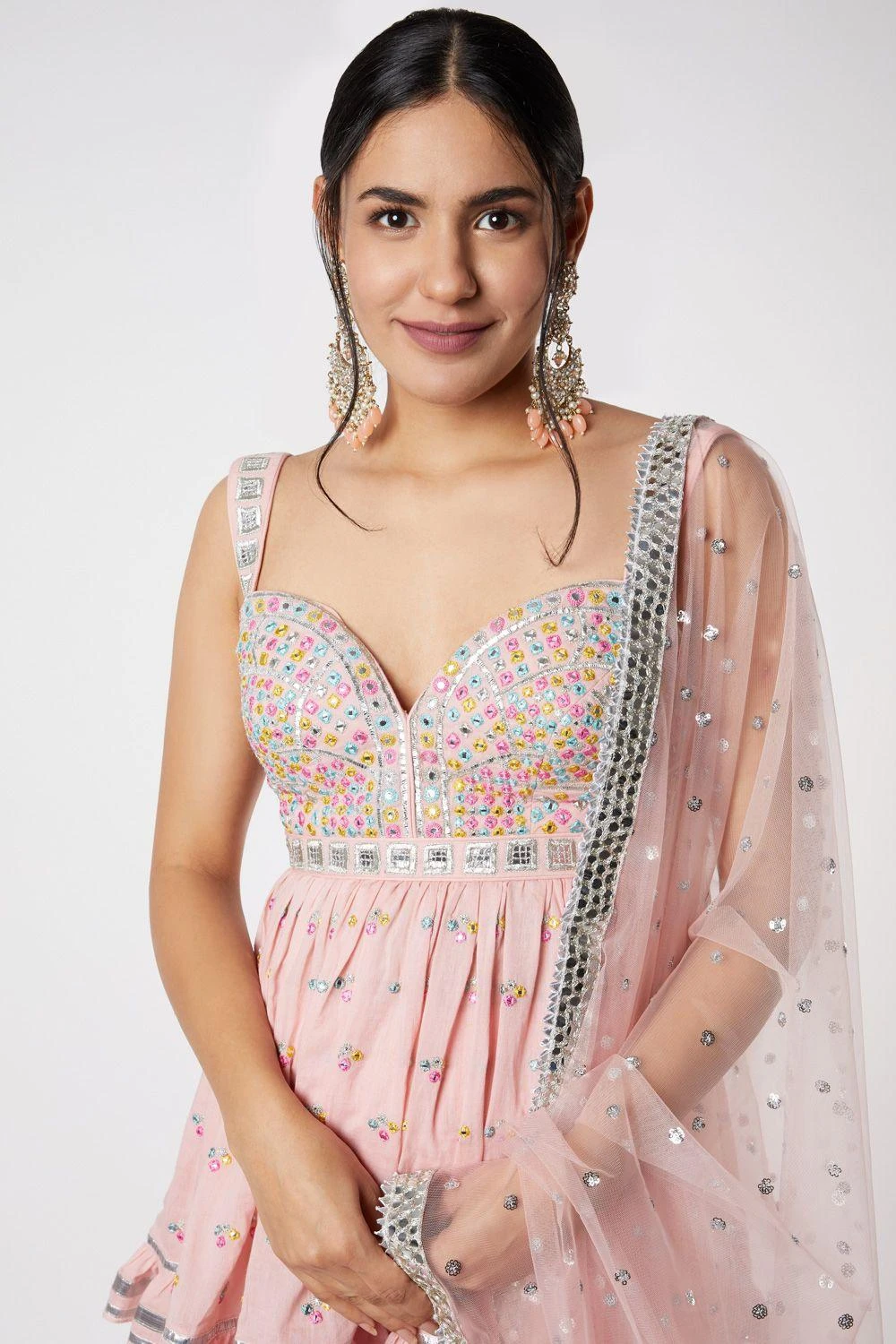 This short sleeveless peplum in pink color comes with a matching sharara and dupatta. The gathers on the waistline gives an ounce of flow to the outfit and the sweetheart neckline of the kurta is embroidered with mirror, thread and gota applique.