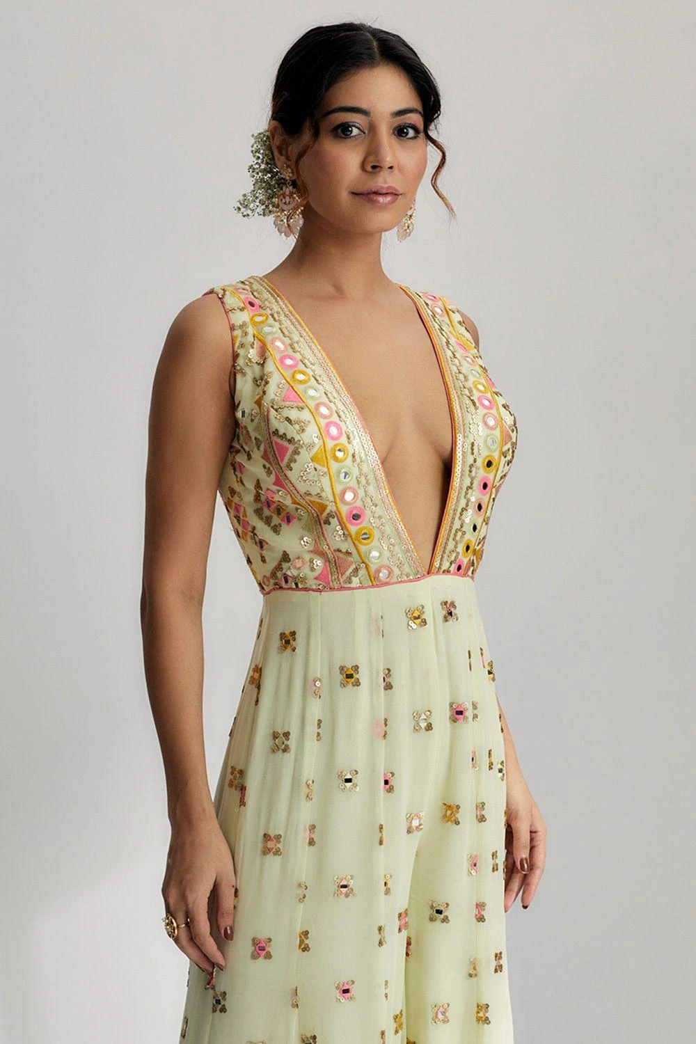 This Rihanna Jumpsuit, merges equisite craftsmanship with vibrant design. A work of art, it boasts intricate hand and machine embroidery, adorned with sequins, colourful pompoms, and mesmerizing tassels, embodying elegance and style.