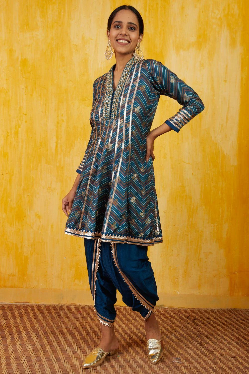 Make a flair at your festivities in this teal zari woven kurta & dhoti set. The kurta is made in tussar base and enhanced with gota work. It is paired with matching dhoti pants. Style it with a pair of polki jhumkas.