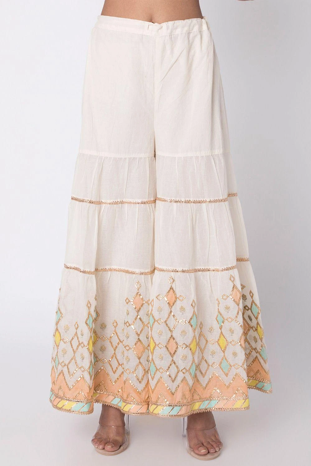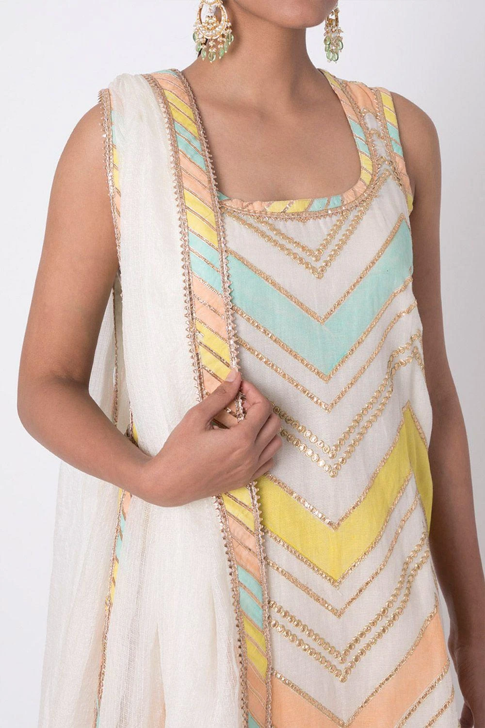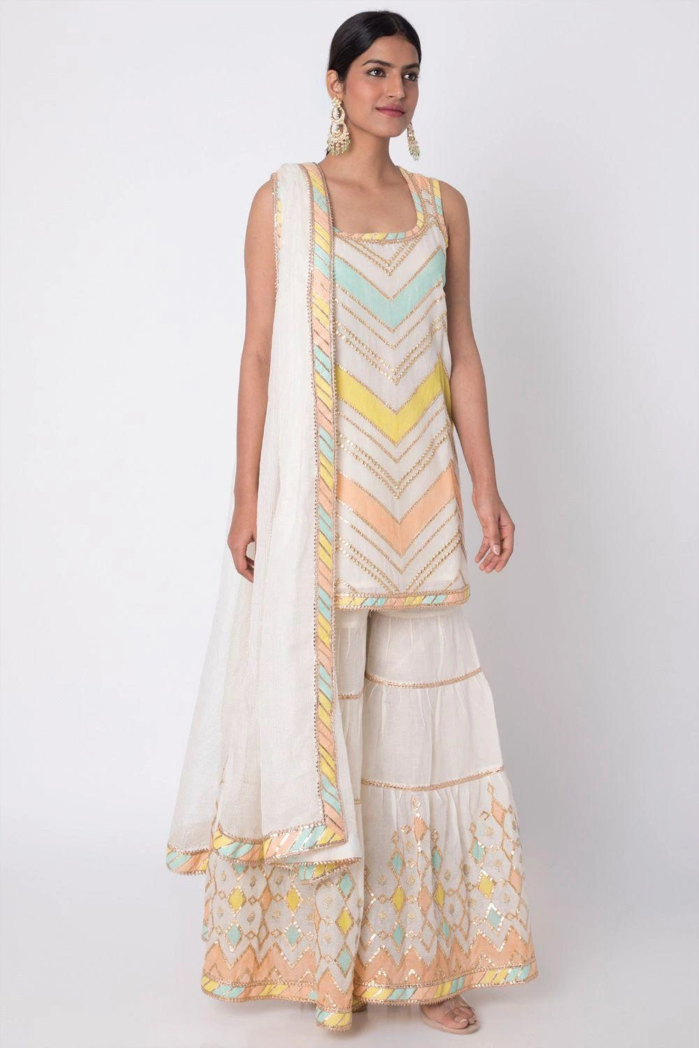This organic cotton sleeveless kurta with gota and applique chevron detailing is a perfect bridesmaid look ! Along with the gathered sharara and kota dupatta, accessorize with a kundan choker or earrings to take the look up a notch!