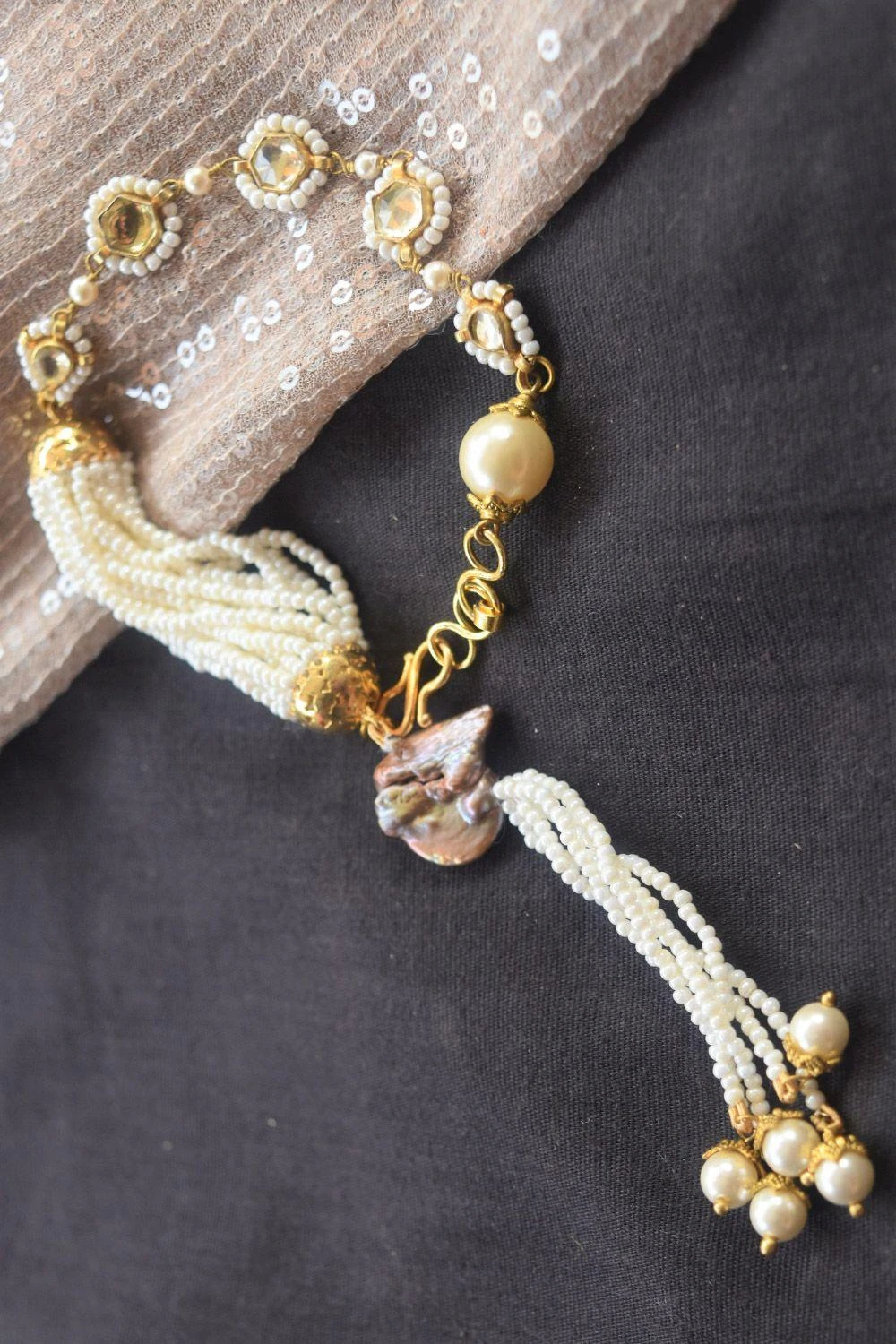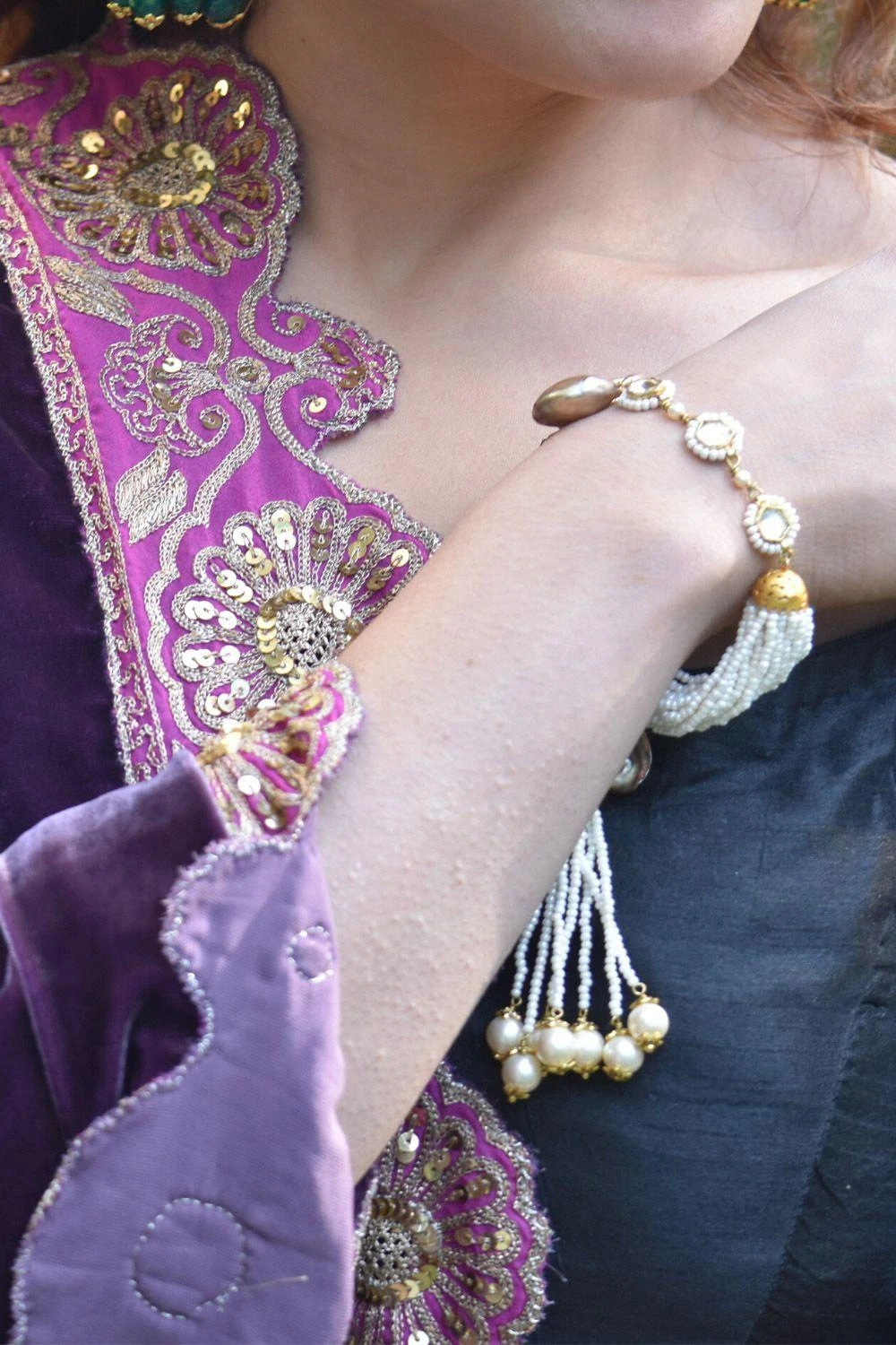 Step into the realm of timeless elegance with this bracelet. The intricate hand-done pearl work, adorned with muted colours of dull gold and champagne pink, adds a touch of sophistication.