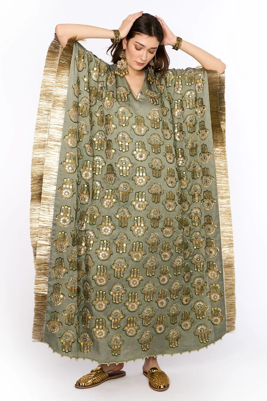 Notch up your evening looks with this easy buoyant banjara kaftan which is both comfortable & stunning. It is made in linen satin and uplifted with exquisitely done hand embroidered hamsa details.