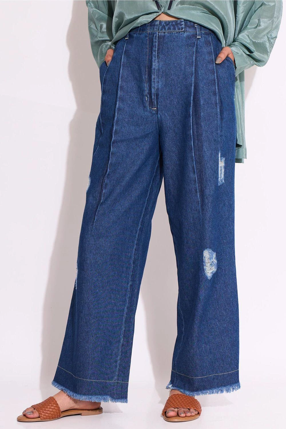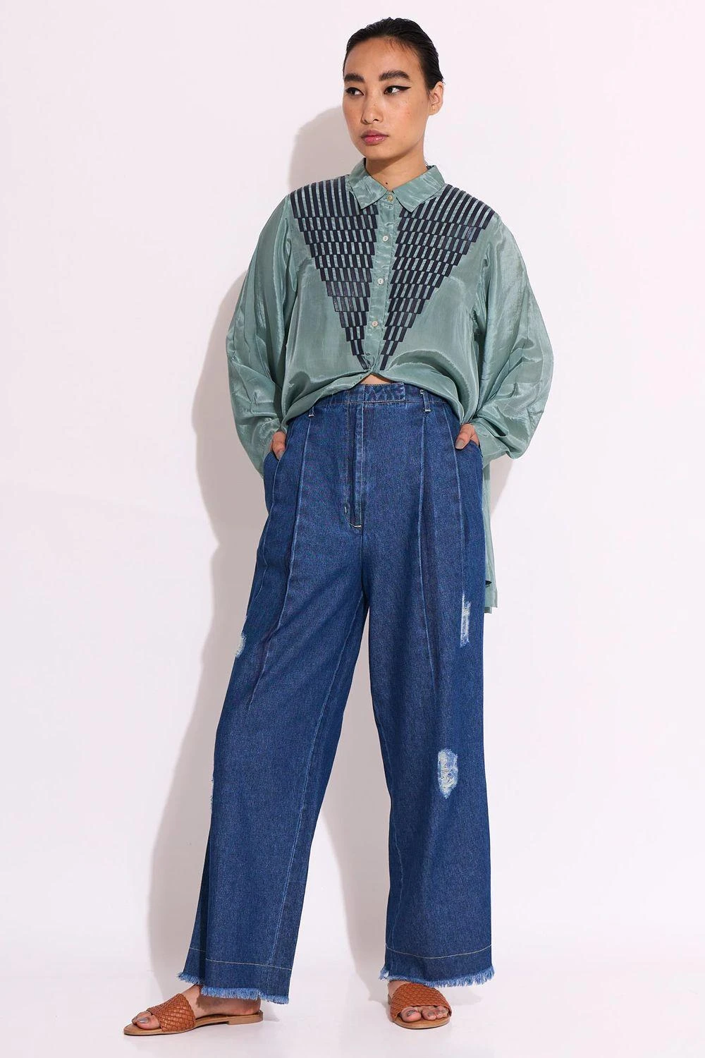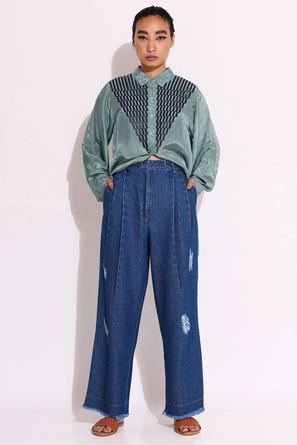 These smoke blue denim pants are a great pair to be on the go. These feature front pleats and frayed hem for a raw look. You can style them with literally anything from your closet.
