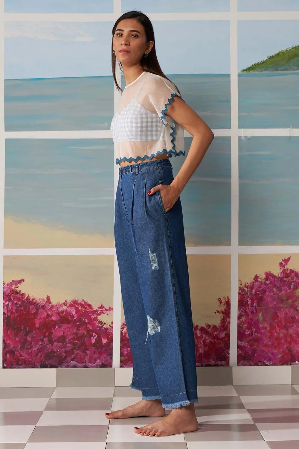 This stylish sheer top & bralette set is perfect for the summer and a great choice for your vacation wardrobe. The top is spun in a thin chanderi with delicate embroidery details. While the gingham bralette adds an understated element of colour.