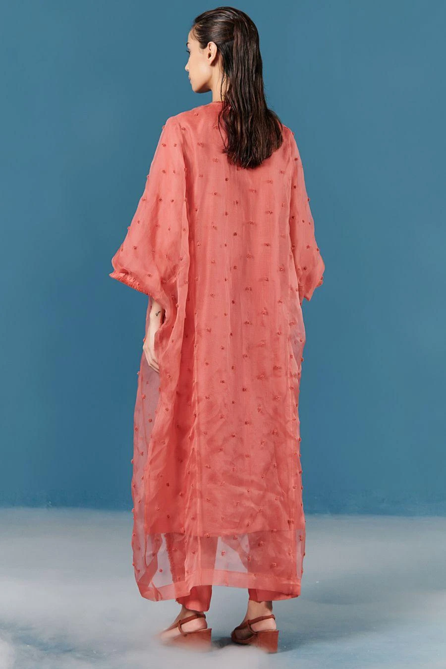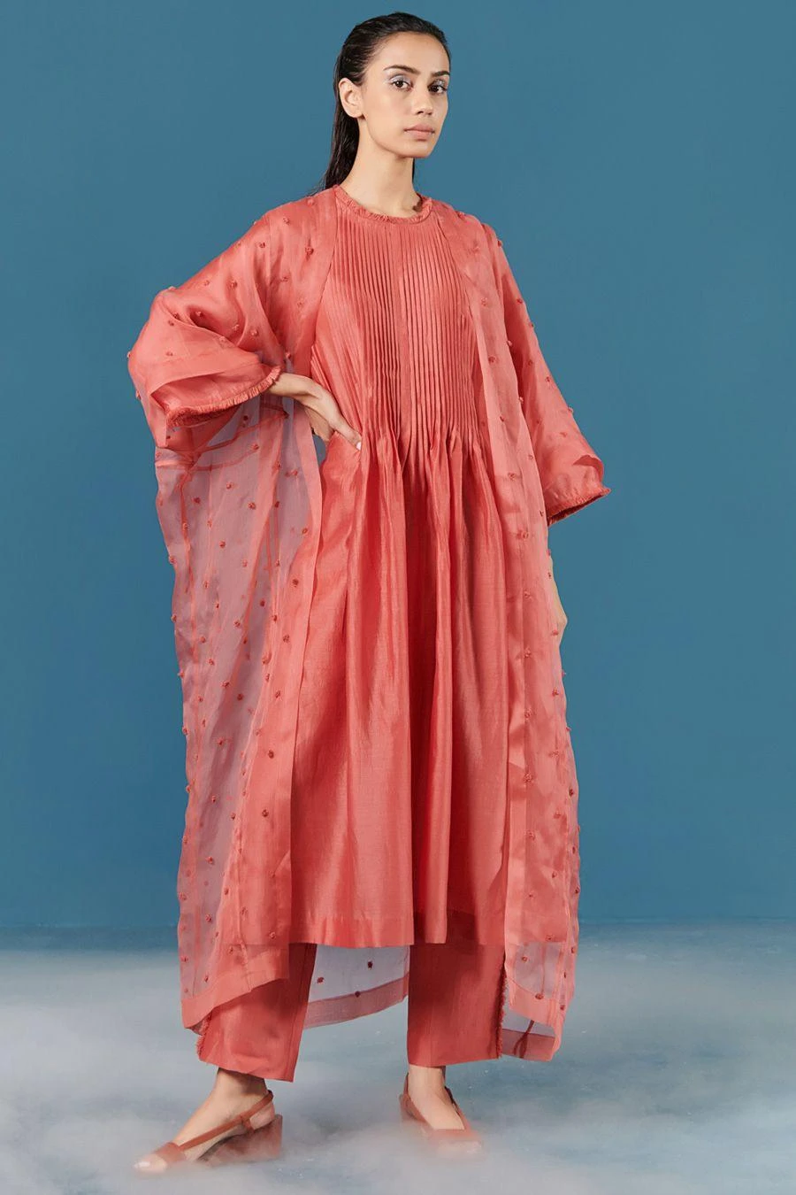 This brick dust cape set wonderfully fuses a minimal and feminine aesthetic. Crafted in silk & chanderi, this set features a pom pom kurta with straight fit pants & an organza cape. Style it with a pair of dangler earrings to complete the look.