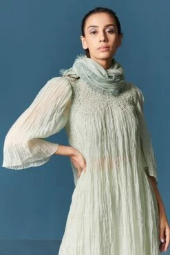 Take your layering game a notch higher with this green lily scarf. Crafted in chanderi, this scarf features a corded hem. Layer it over a kurta set from the collection to complete the set.