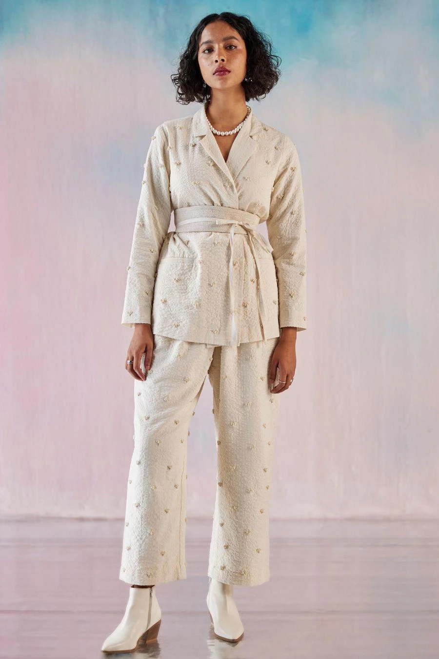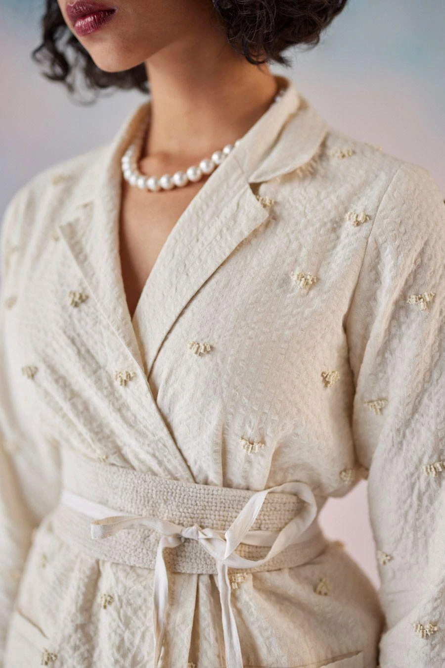 In an elegant ivory hue, this Pearl Obi belt features a thick elastic band crafted with fabric smocking. Simply tie the band to your desired level of comfort and style.