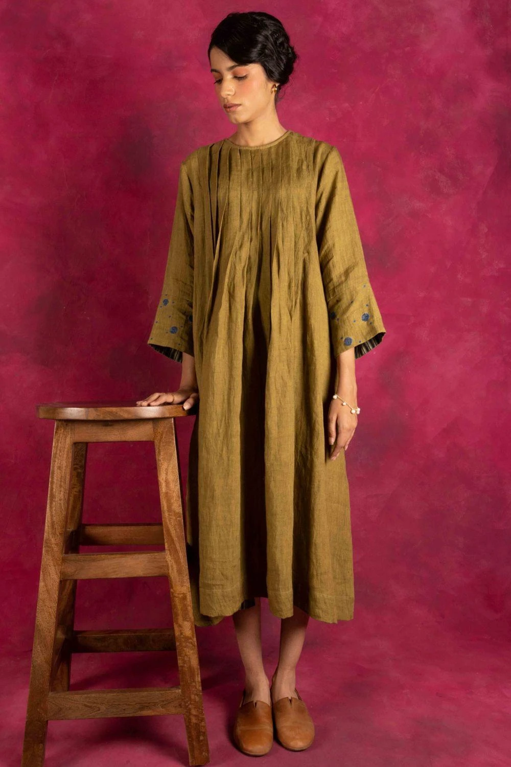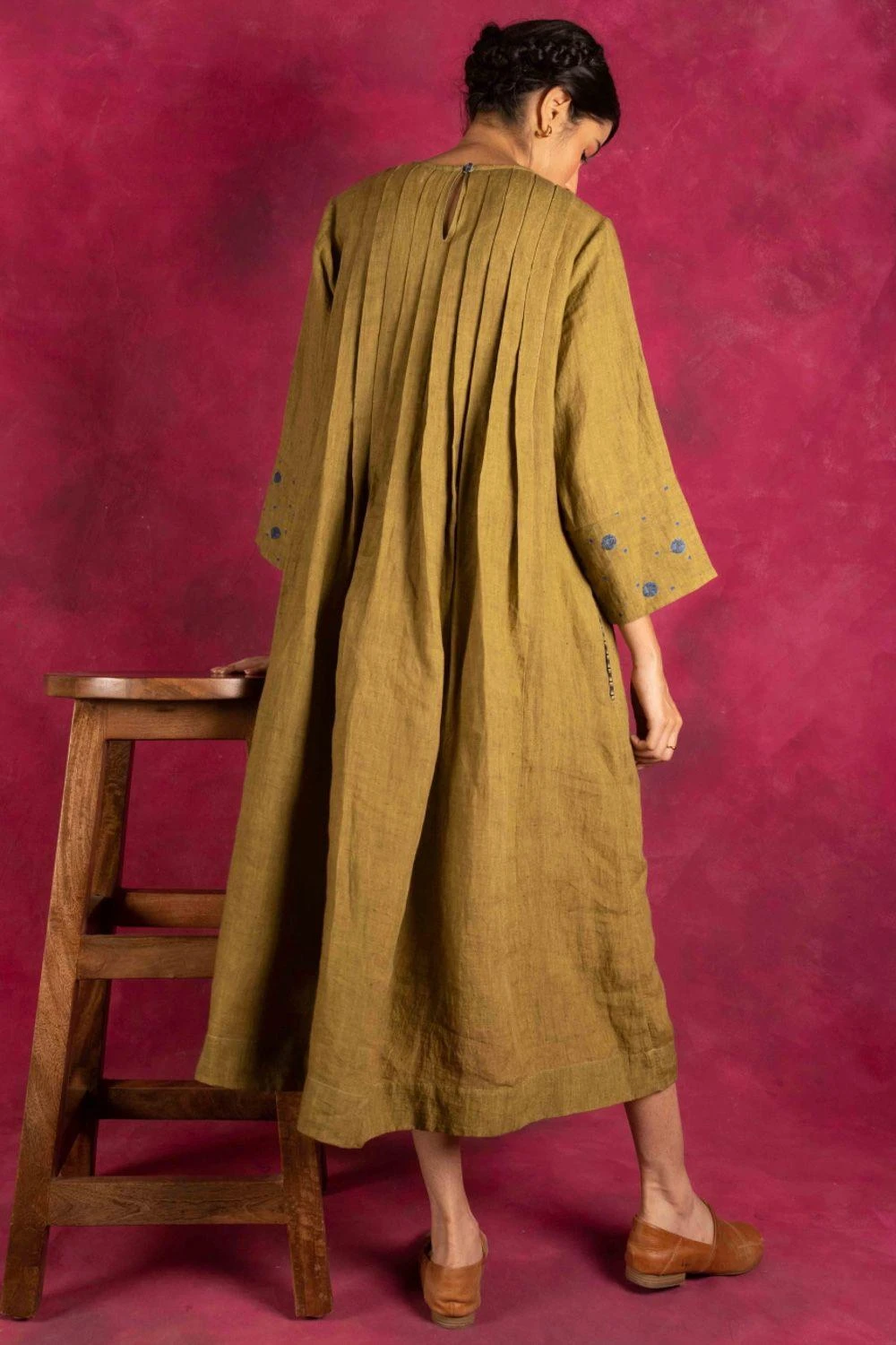 Classic & comfortable, this olive green dress is a great pick for your everyday looks. Cut in handwoven linen, this dress features front & back pleats with embroidery details on the sleeve cuffs. Style it solo or team it up with a pair of pants.