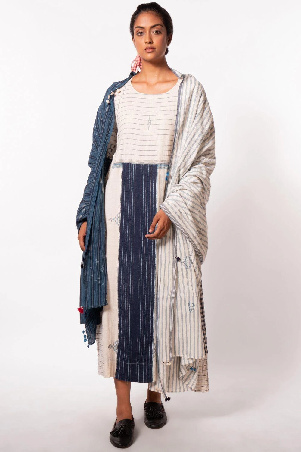This printed scarf in hues of blue and white features striped details all over. Style this scarf over a white shirt or day dress.