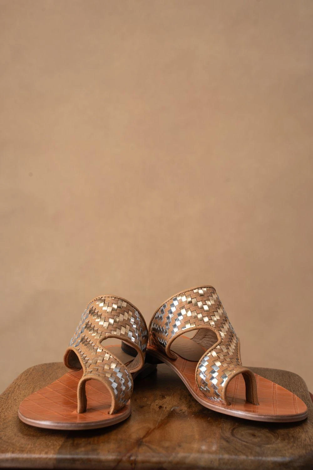 Elevate any outfit with these exquisite beige hand-crafted leather flats adorned with intricate gold & silver woven lace details. Versatile elegance perfect for formal soirÃ’es & casual affairs, pair them with dresses or jeans for a touch of glamour.