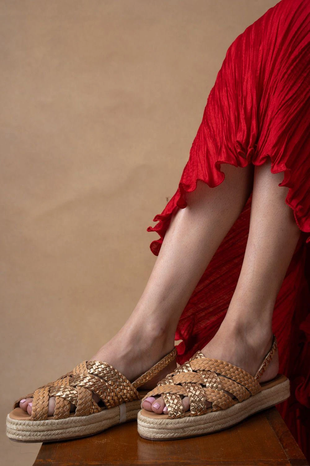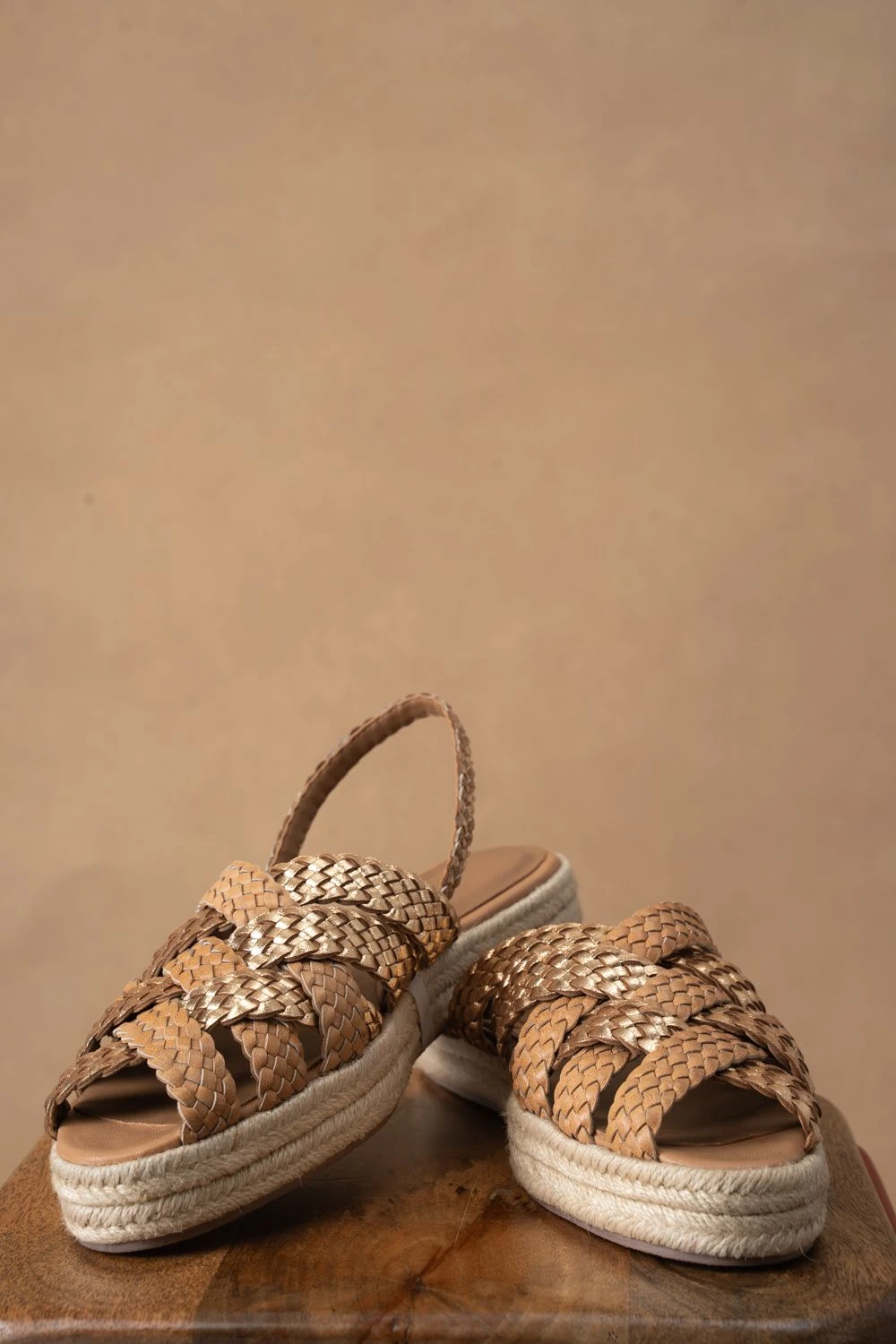 Indulge in style with these beige hand-crafted leather flats, adorned with braided gold & beige criss-cross strap details. Effortlessly chic, these are perfect for casual strolls or dressed-up moments. Sophisticated comfort awaits your every step.