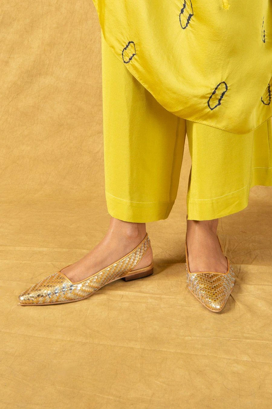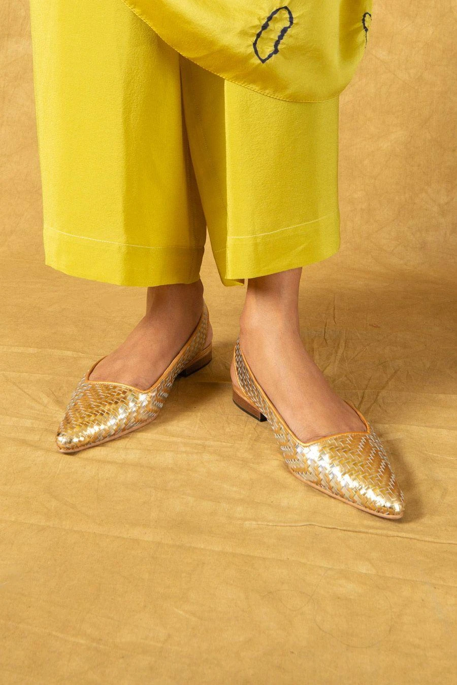 These gold braided mules are versatile enough to be paired with both Indian & contemporary looks. It is handcrafted in genuine leather and offers the utmost comfort with its soft rubber soles.