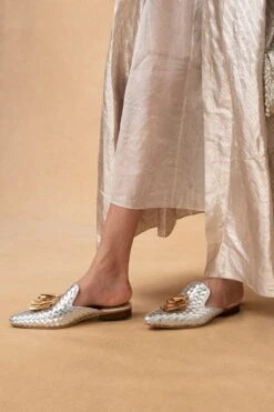Indulge in opulence with these mesmerizing grey hand-embellished mules. The gleaming grey hue adds a touch of glamour to any occasion, while the meticulous craftsmanship ensures a comfortable and stylish experience.