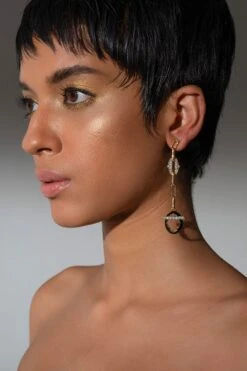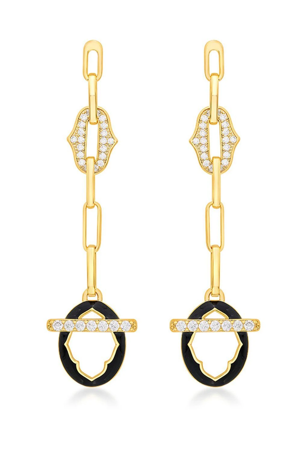 Elevate your style with these Sliving Long Drop Earrings. 18-karat gold plating and dazzling CZ combine with modern link and bar design, accented by delicate Mughal enamel touches. An exquisite blend of glamour and contemporary sophistication.