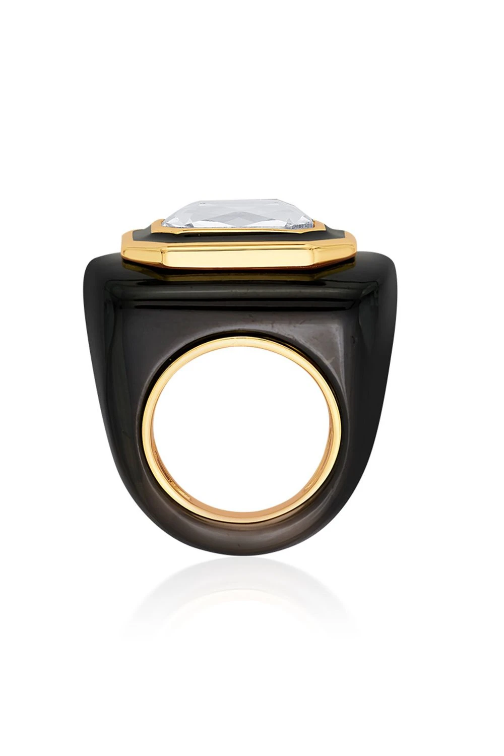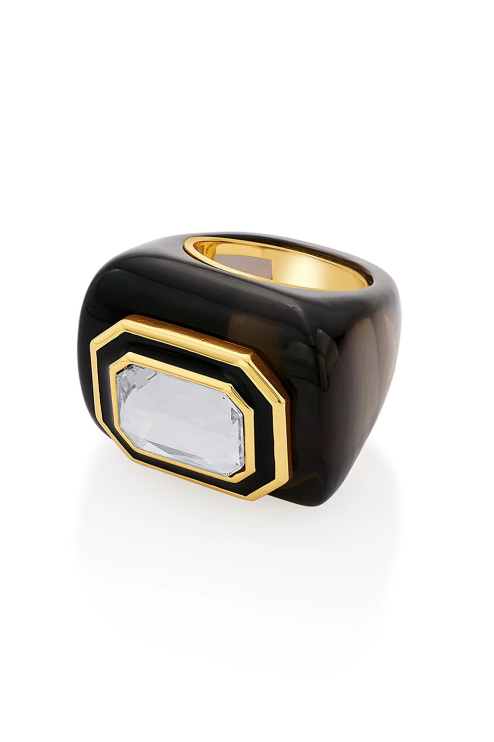 Isharya’s hexagon design signet ring, detailed in black, gold, and grey tones, embodies enduring sophistication in 18K gold plating is an heirloom worthy piece for timeless elegance.