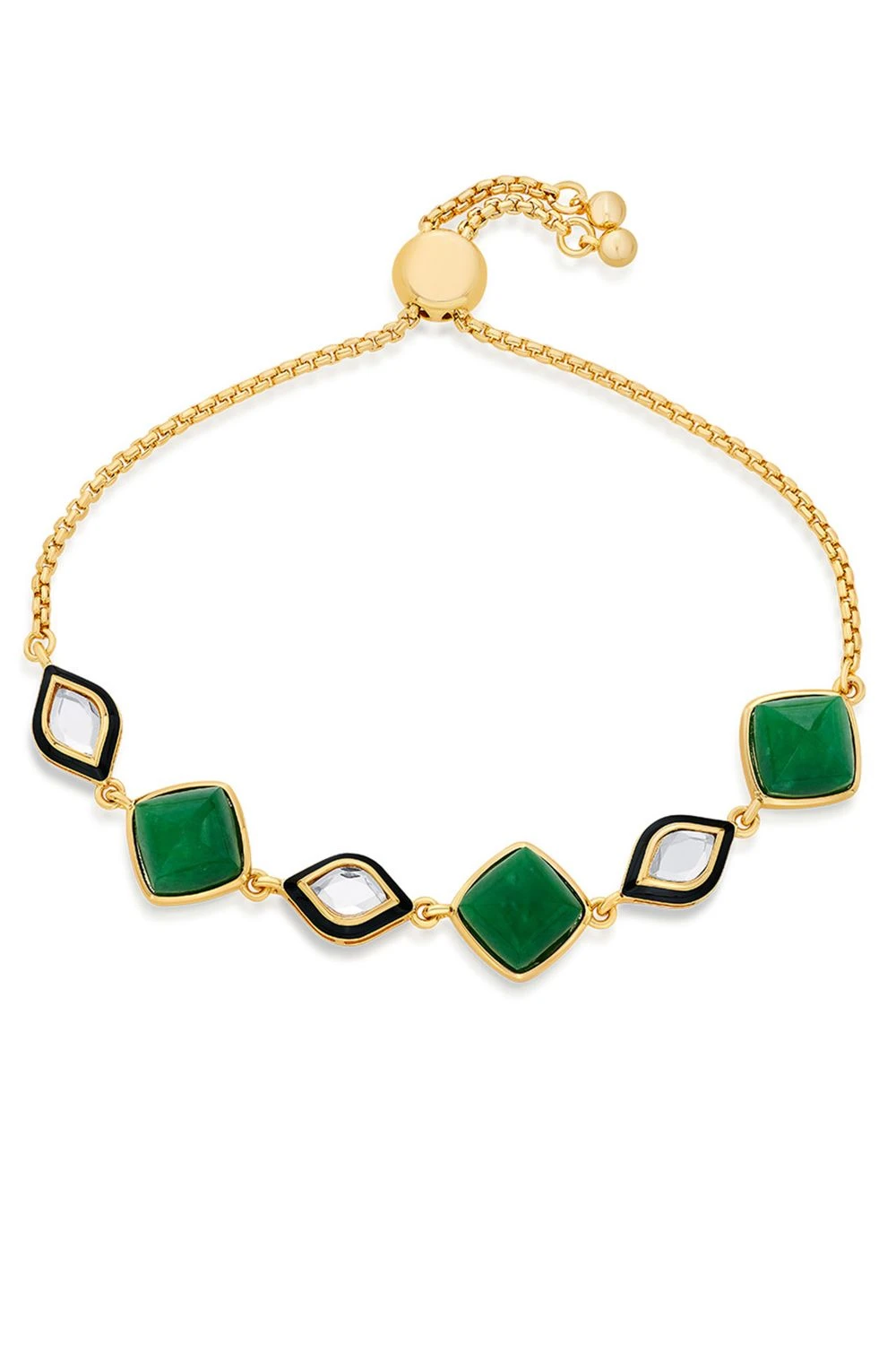 Embrace understated luxury with this versatile 18-karat gold-plated bracelet, showcasing a delicate row of polki-cut mirrors and accentuated by mesmerizing green jade. A refined addition to any ensemble, it effortlessly exudes timeless elegance.