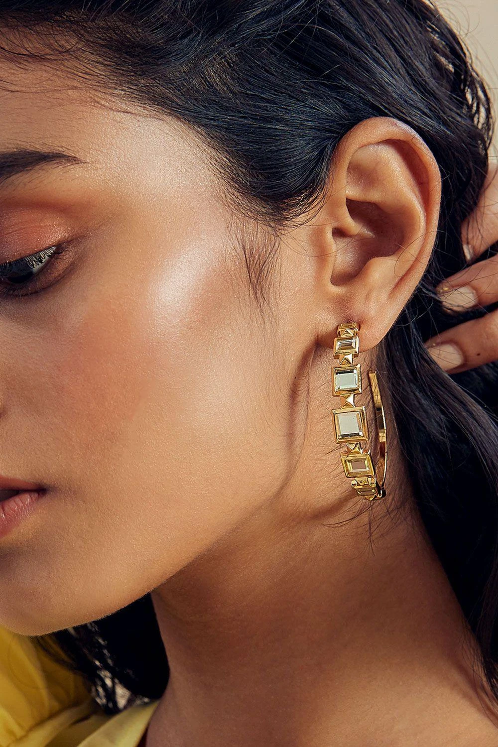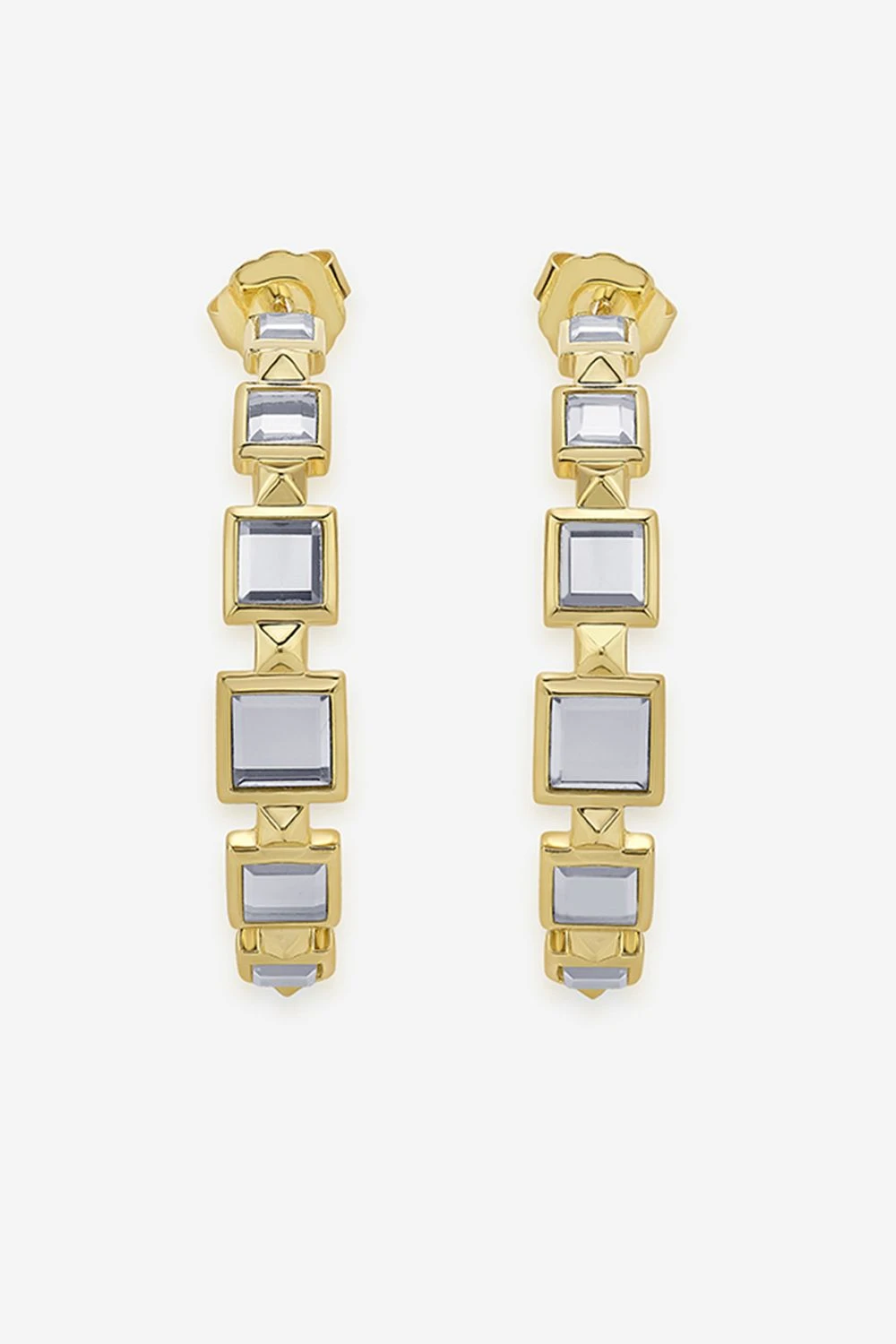 Step into the spotlight with these hoop earrings. These earrings feature a unique design with mirror accents & pyramid-shaped metal details. The combination of sleek lines and reflective surfaces adds a touch of elegance to any ensemble.