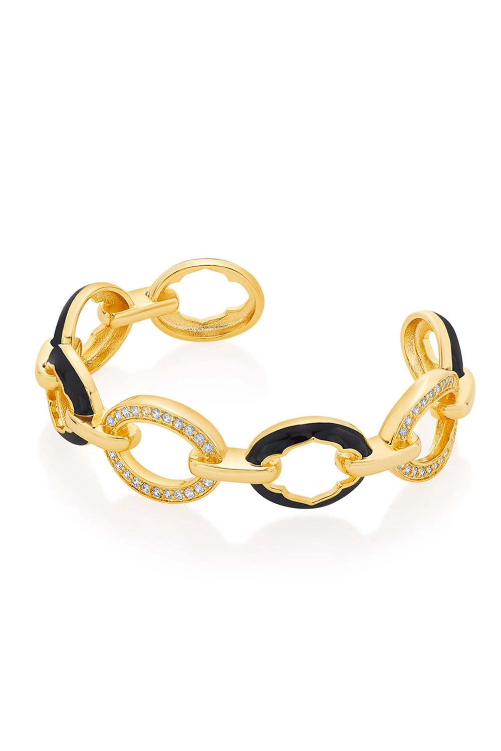 This exquisite cuff bracelet, adorned with 18-karat gold-plating, rich enamel work, and dazzling CZ stones, is a true masterpiece.