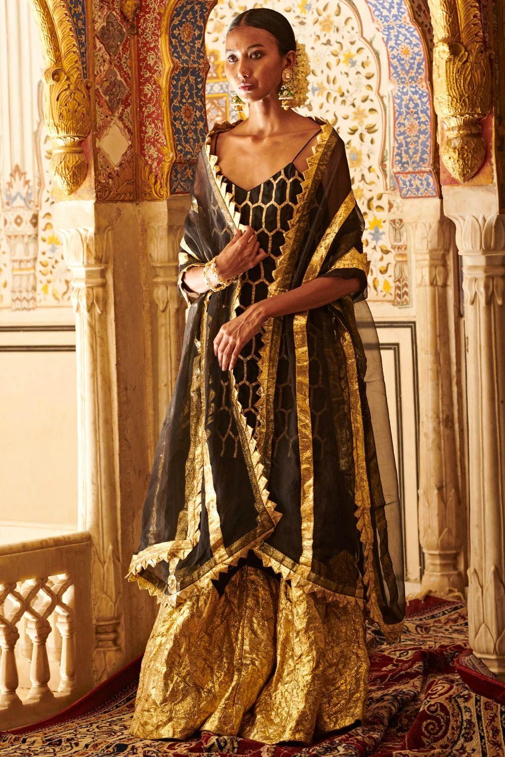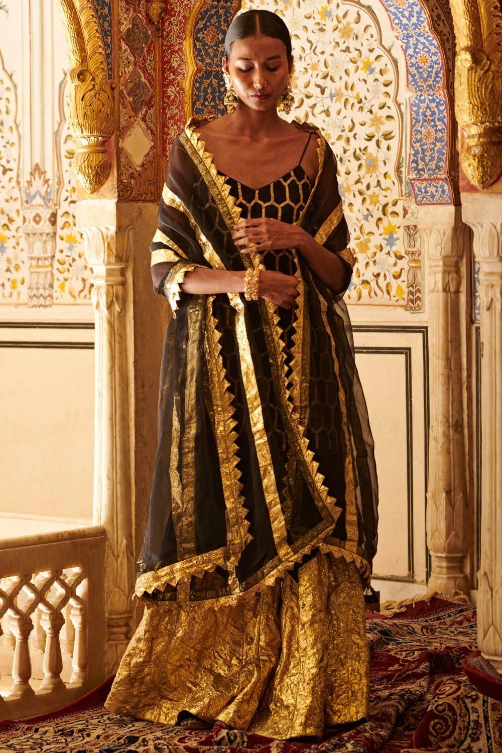 This black embroidered sharara set will see you through all kinds of celebrations. It features a strappy kurta with a honeycomb pattern all over paired with a sharara & dupatta. Style this set with a pair of statement earrings to complete the look.