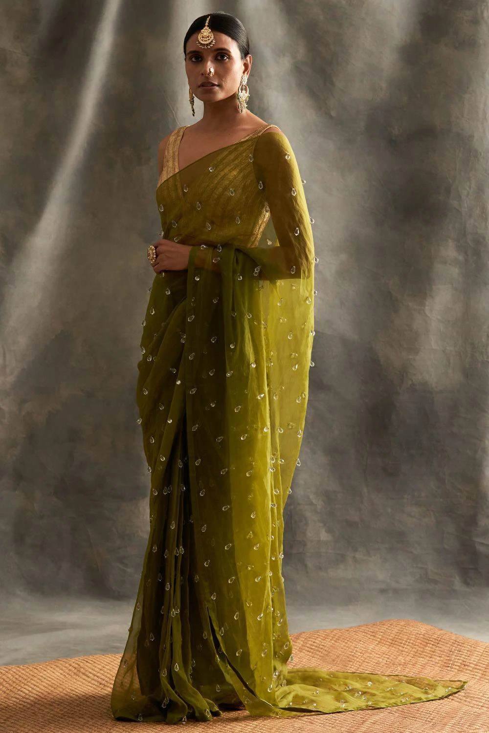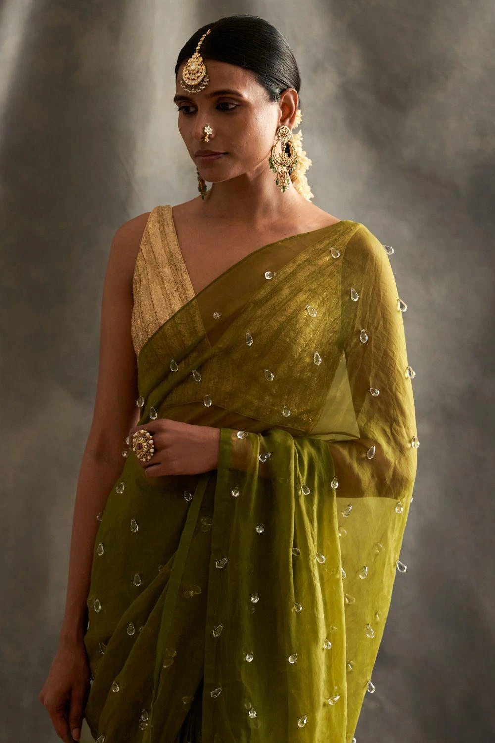 This elegant moss green sari is set in luxurious silk organza fabric & adorned with glinting swarovski crystals. It is complemented with a plunging neck golden lampi blouse. Add a delicate maang tikka to this look.