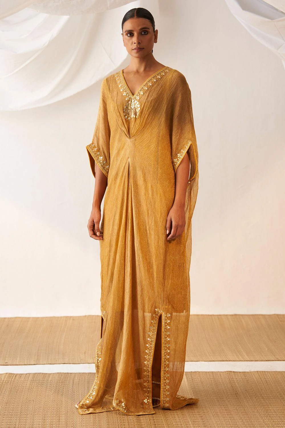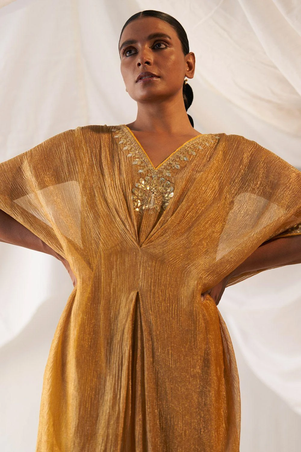 The perfect amalgamation of style and comfort, this kaftan works across occasions. Crafted in tissue & cotton, this set features a gota patti embellished kaftan paired with a coordinating slip. Add a pair of statement earrings to complete the look.