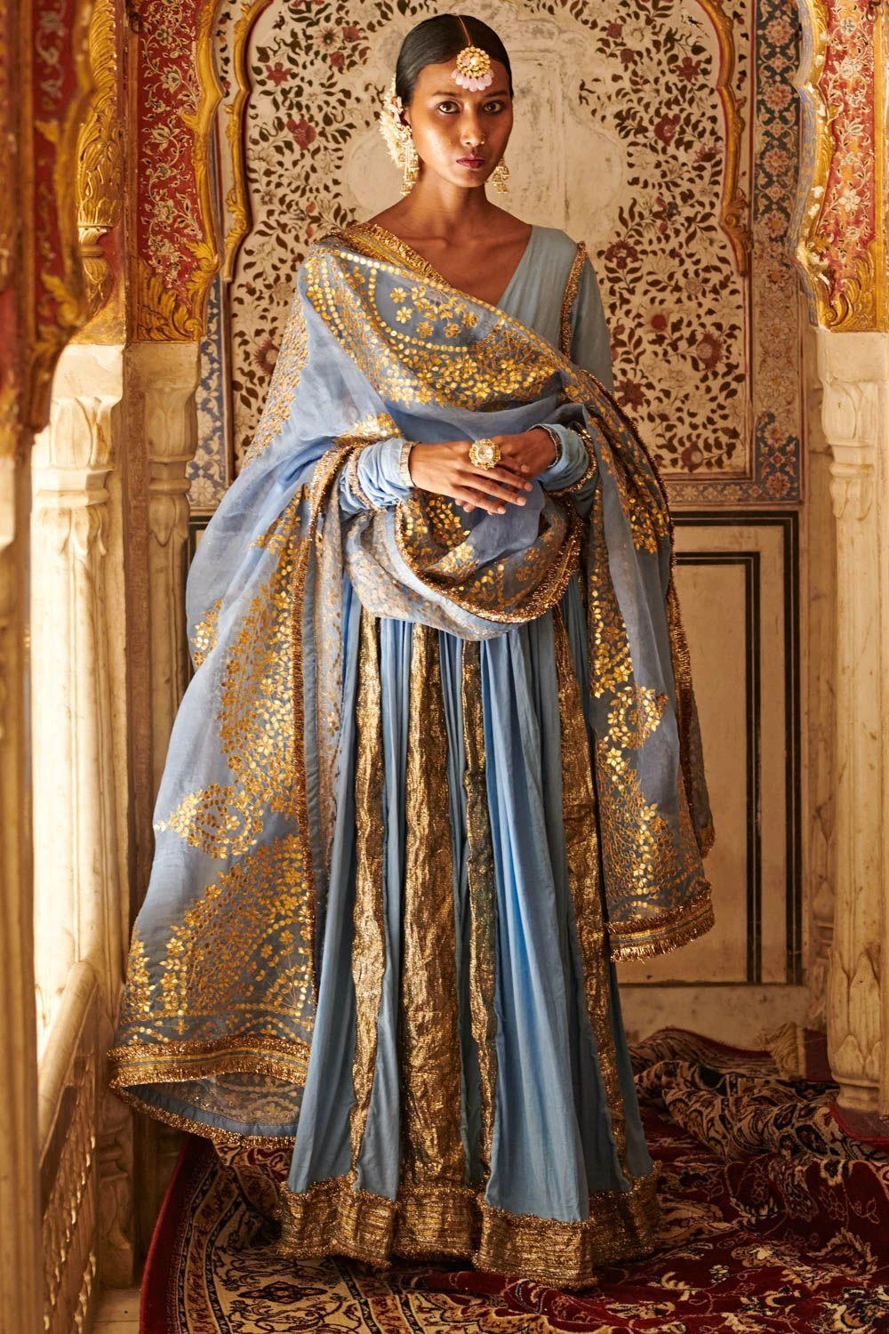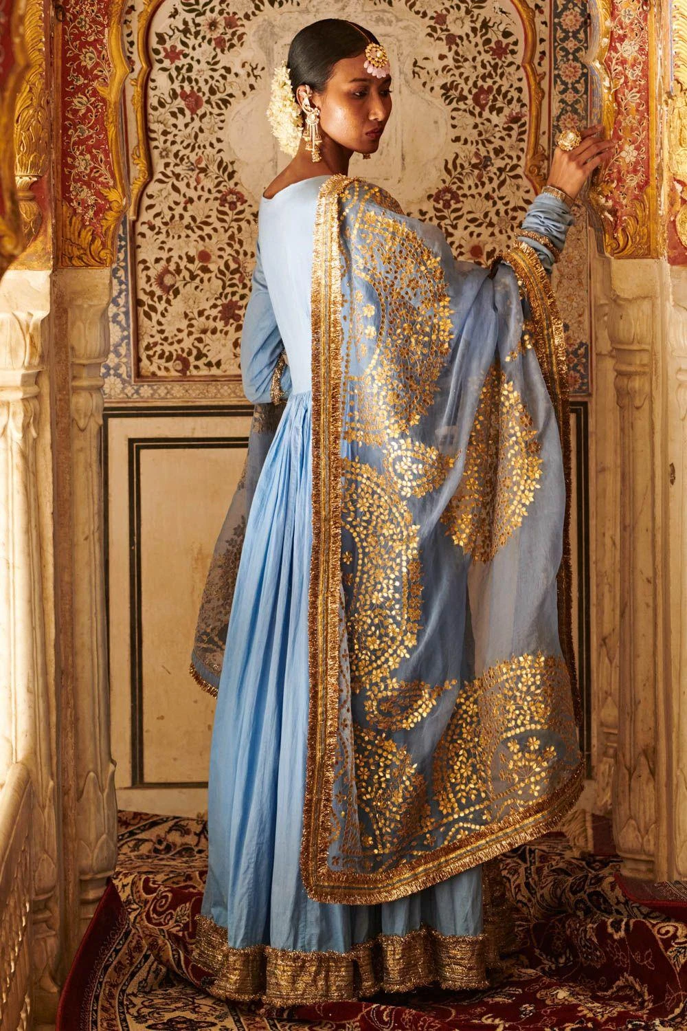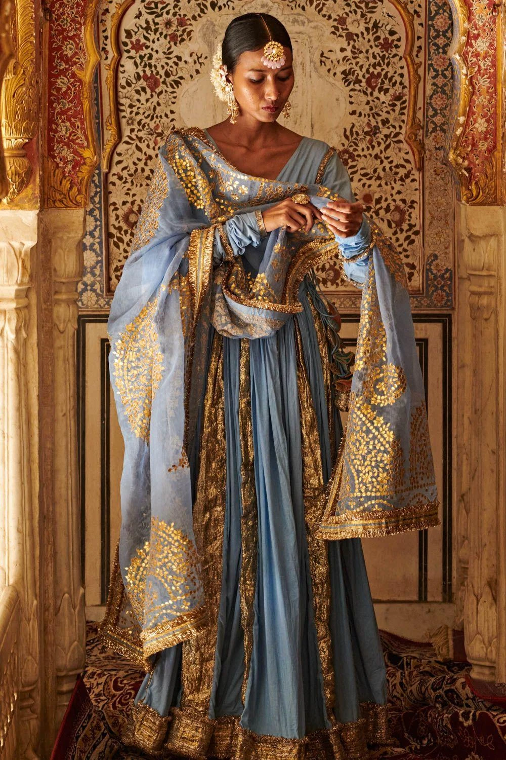 This powder blue angrakha set will see you through all kinds of celebrations. It features subtle embellishments paired with a gota patti dupatta and a churidaar. Style this set with a pair of statement earrings & potli bag to complete the look.