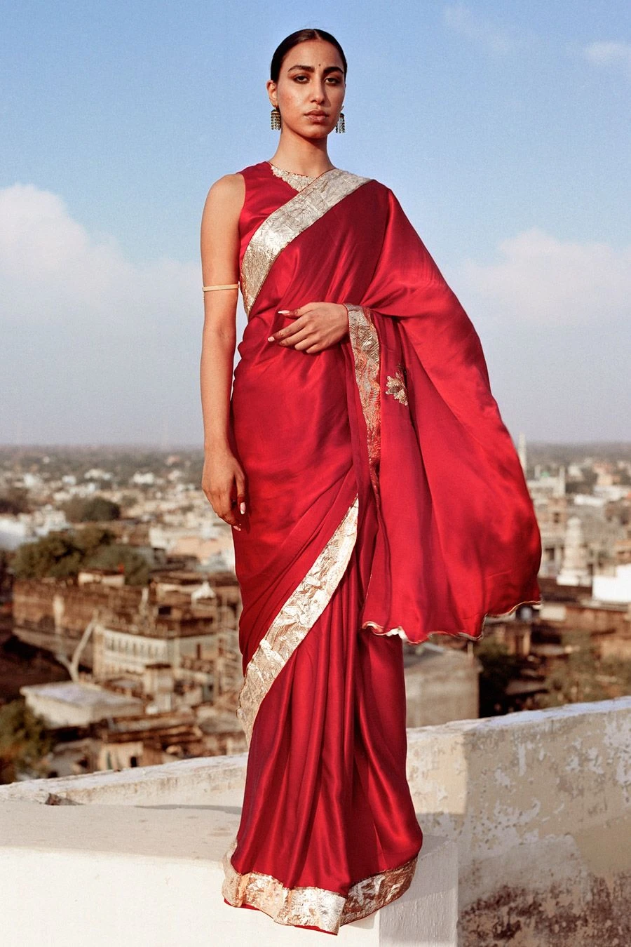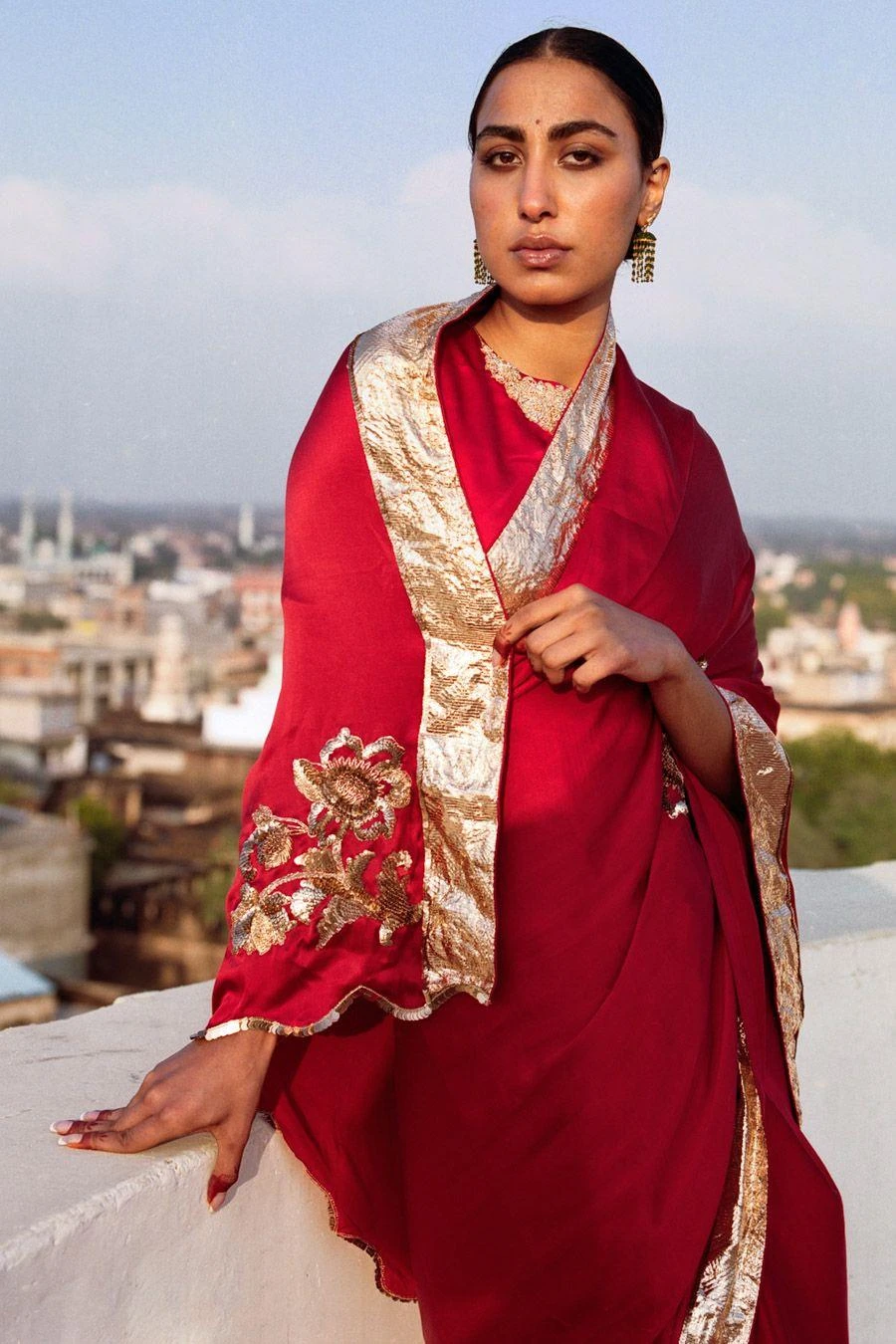 Jadon’s heirloom pieces will have you looking effortlessly stylish. Crafted in mulberry satin silk, this Ajna sari in molten copper chintz boota features pittha zardozi, nakshi & aari techniques with custom cuts.