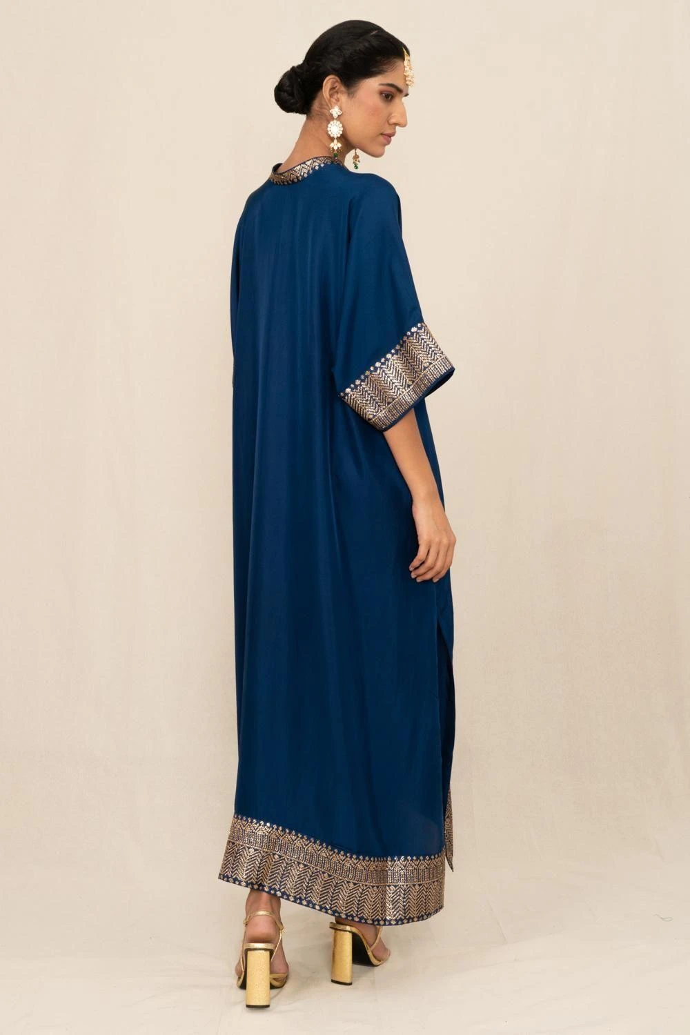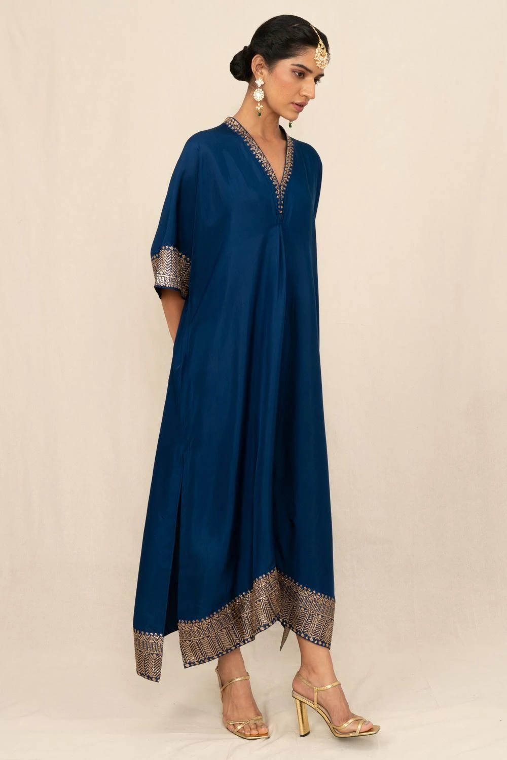 The perfect amalgamation of style & comfort, this kaftan is perfect for pre wedding festivities. It features benarasi embroidery on the borders with a cinched waist & side slits. Style it with a pair of statement earrings to complete the look.