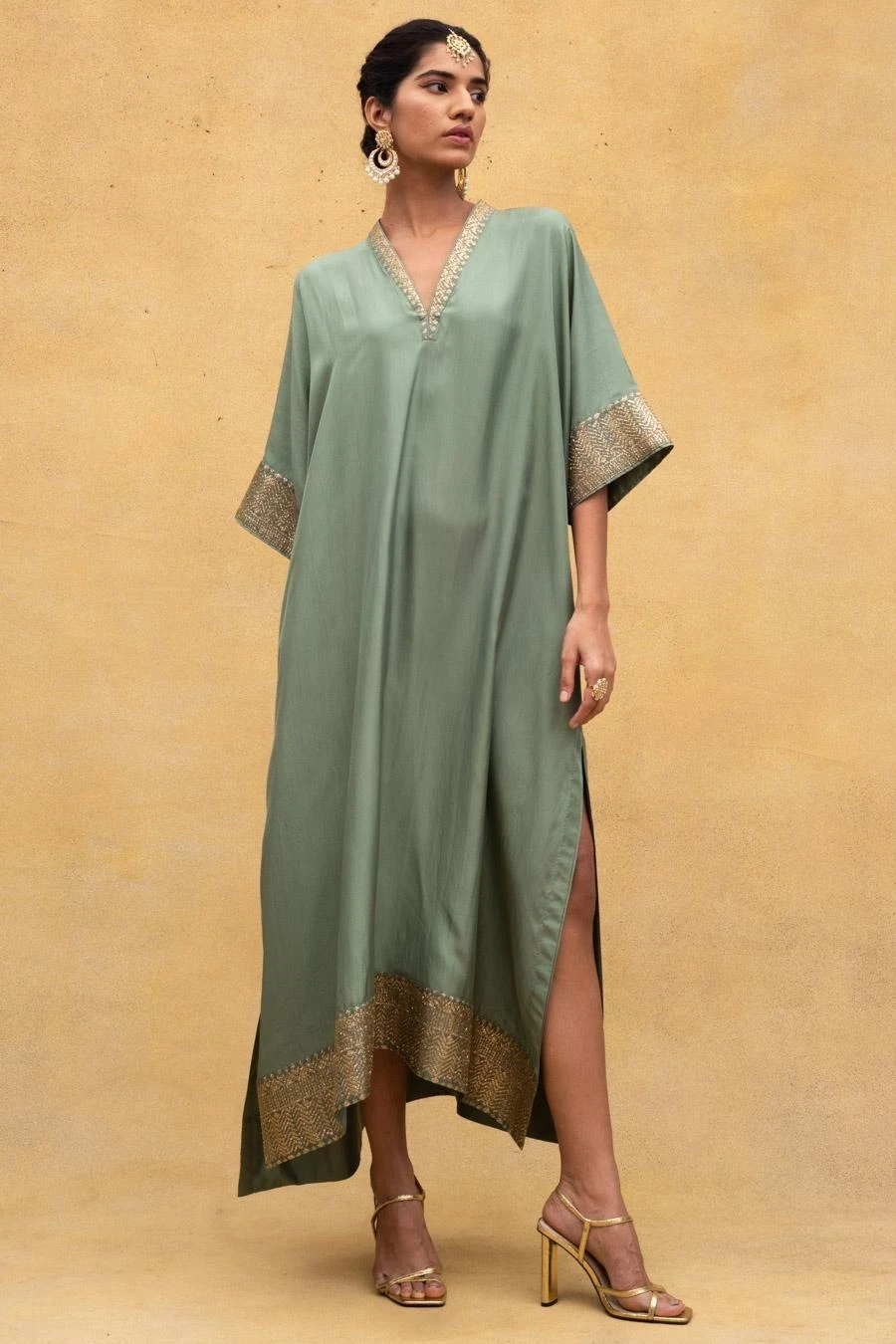 The perfect amalgamation of style & comfort, this kaftan is perfect for pre wedding festivities. It features benarasi embroidery on the borders with a cinched waist & side slits. Style it with a pair of statement earrings to complete the look.