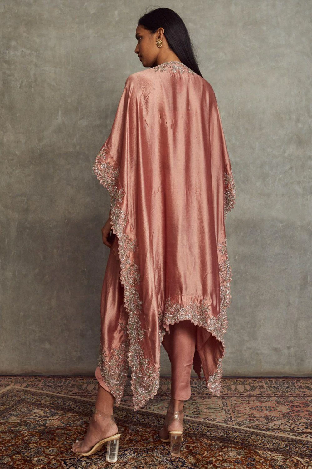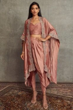 Swap your dupattas for capes this festive season. Cut in silk, this set features an embroidered cape paired with dhoti style pants & a textured bandeau. Style this set with a pair of statement earrings & a clutch to complete the look.
