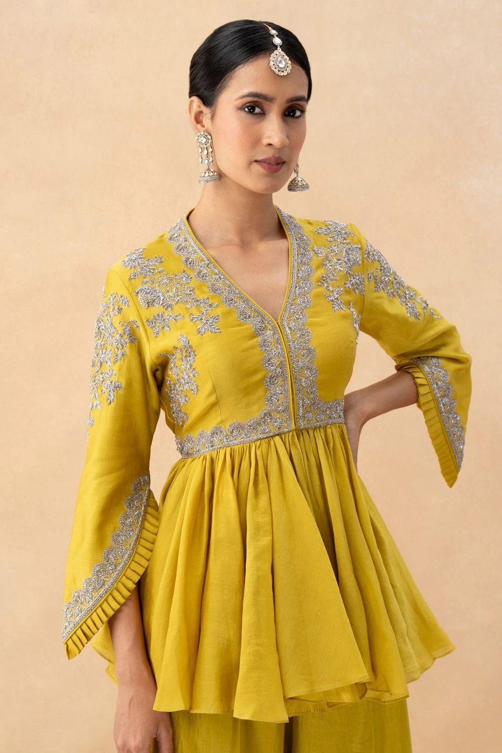 Look effortlessly stylish in this peplum top. Crafted in silk, this top features an embroidered yoke and pleated details. The embroidery gives it that wow factor and it can be styled with a lehenga, dhoti pants or a trouser.