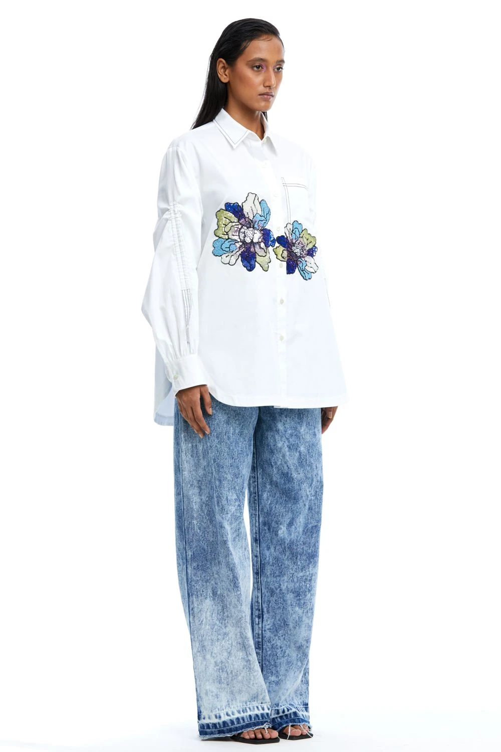 Indulge in luxury with this White Hand-Embellished Shirt. The exquisite contrast stitch detailing adds a refined touch to this elegant piece, making it a timeless addition to your collection.
