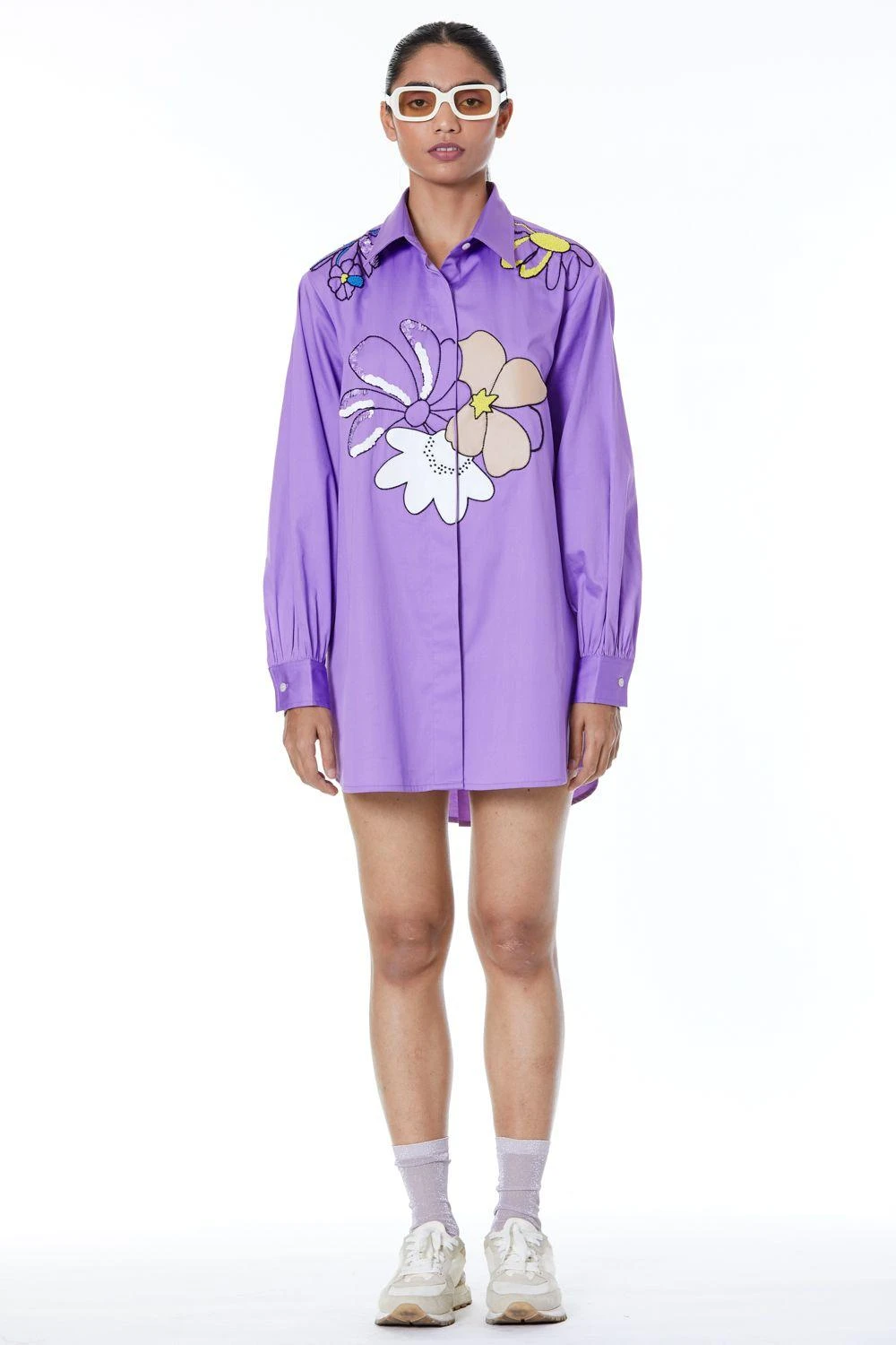 Start your day by slipping into this understated, minimalist lilac shirt dress. It features floral embroidery with contrasting bindings and a box pleat at the back. Pair it with some shoes and gold hoops for a day out.