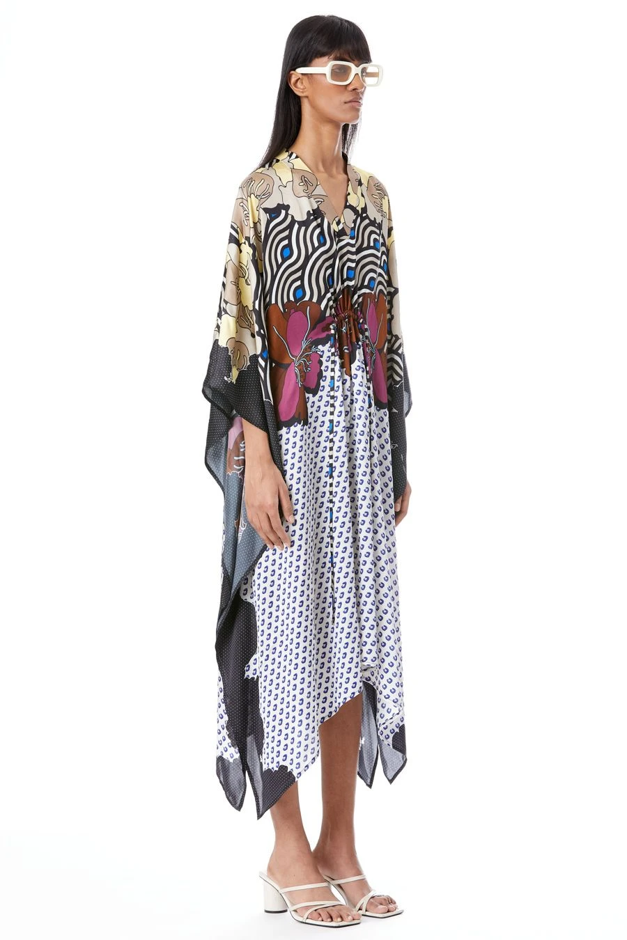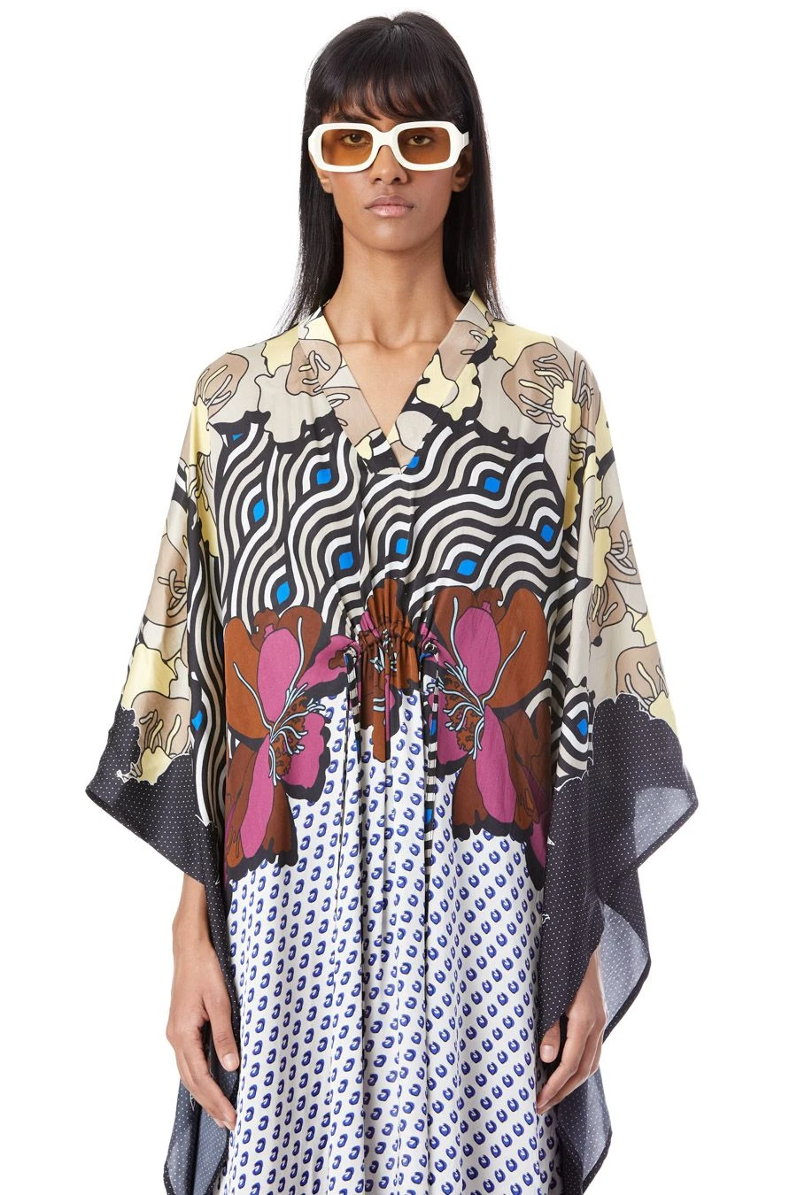 Look sartorially savvy with this kaftan. Crafted in polyester, this abstract printed kaftan features a drawstring detail. Add a pair of dangler earrings to complete the look.