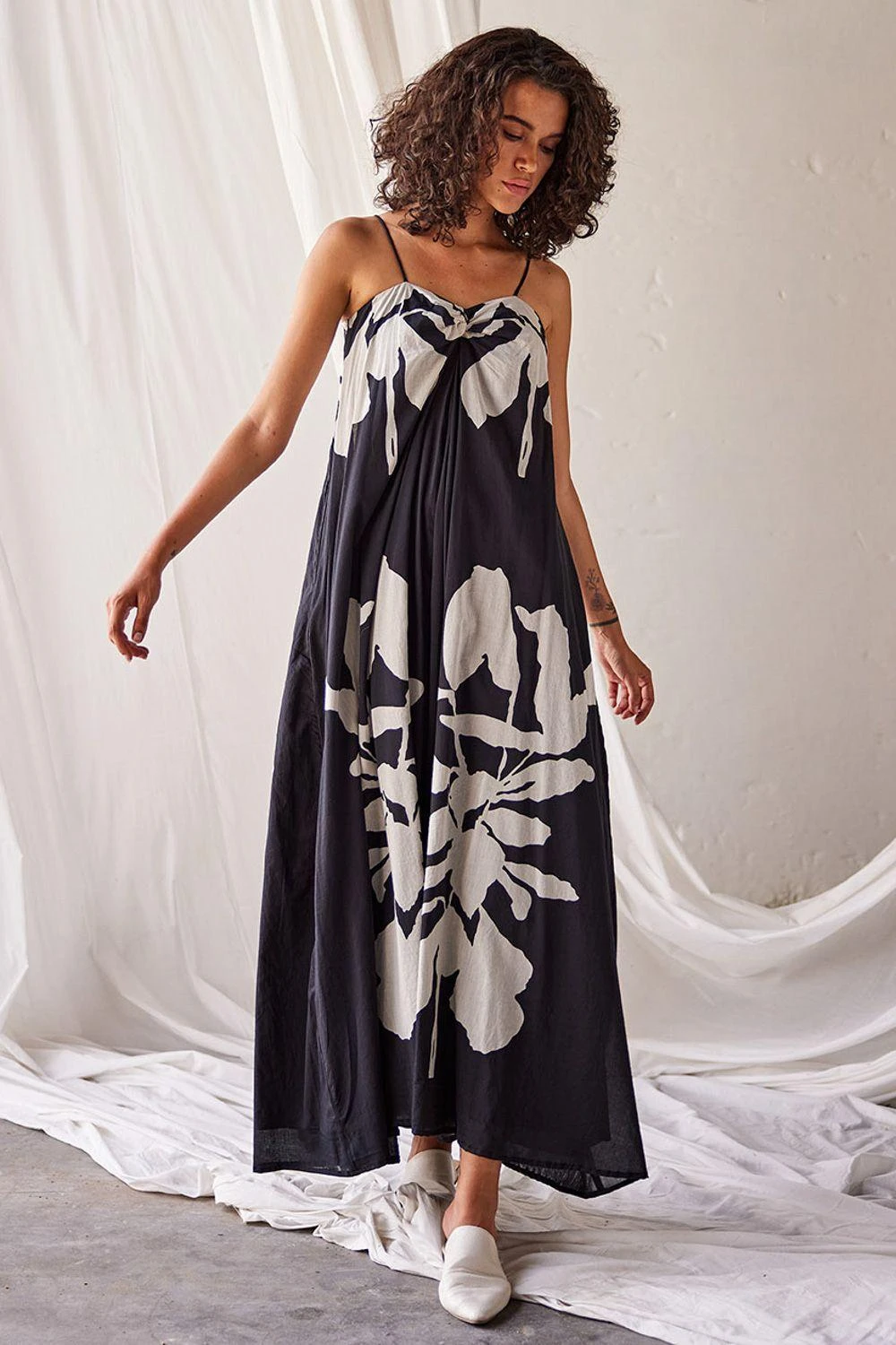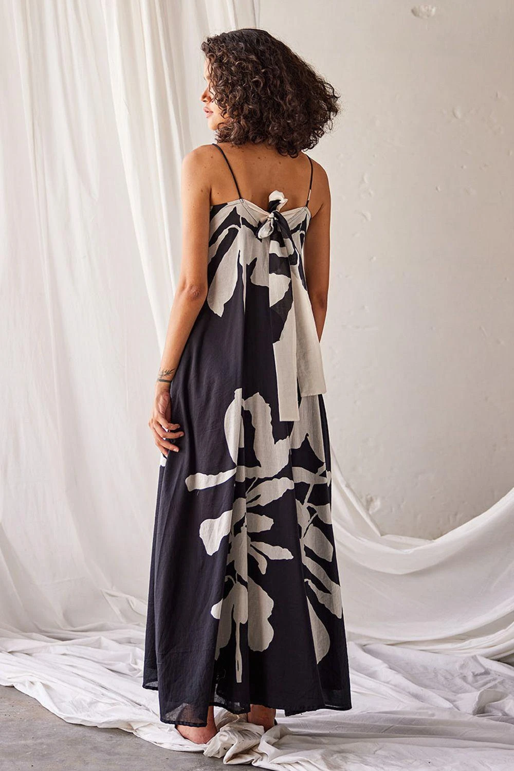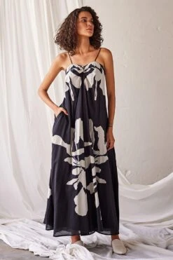 Elevate your elegance with this black and white lino print mul dress. Adorned with delicate spaghetti straps, a chic back zip opening, and a charming tie-up detail at the back, it’s a symbol of effortless sophistication and modern style.