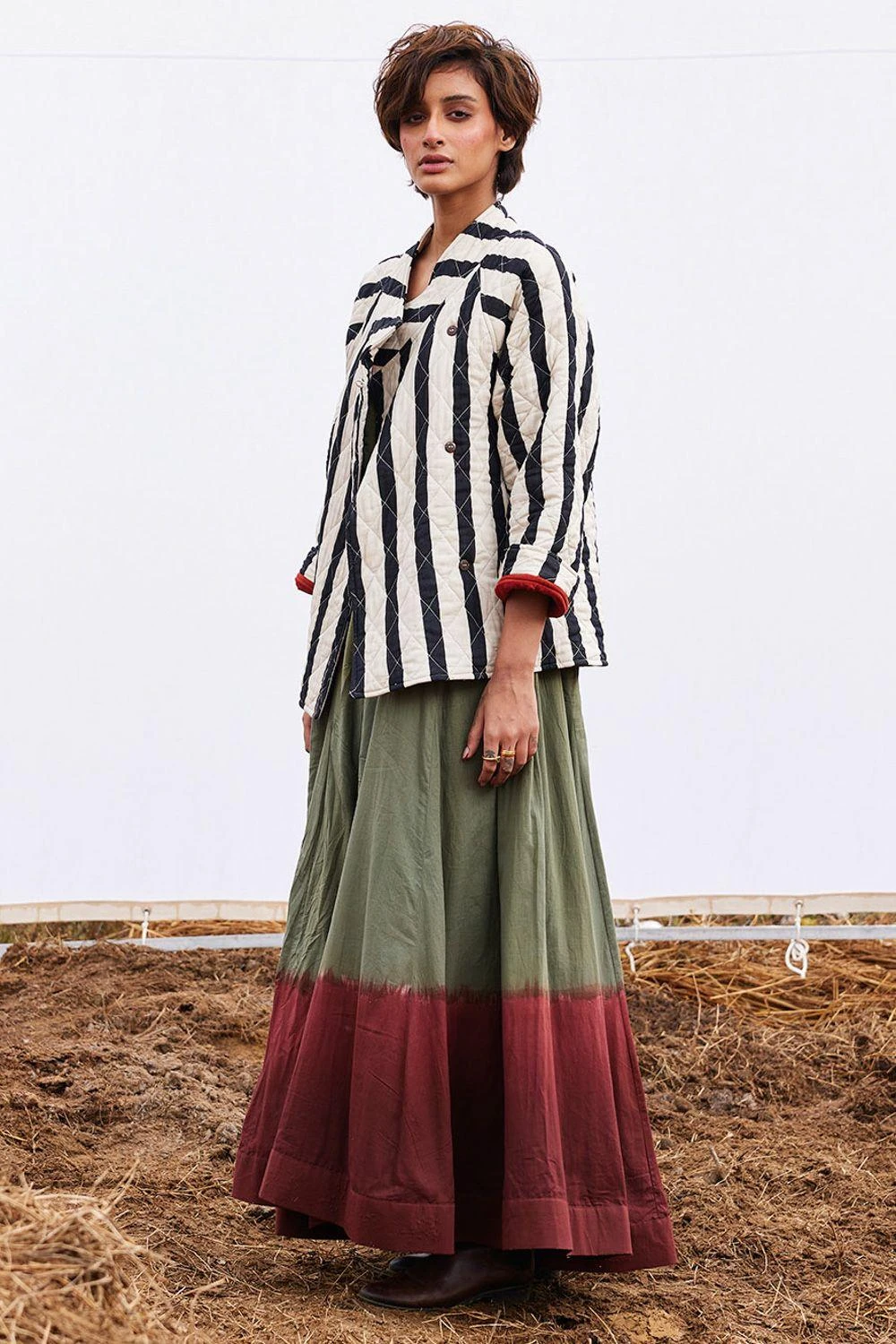 Make a statement in the black & white stripe printed quilted mul jacket. Featuring a stand-up collar, front loop button opening, brick red lining and convenient pockets, it’s chic meets utility.