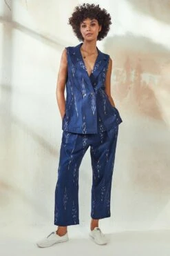 Indulge in timeless elegance with this Ikat set. The loose-fit tunic exudes relaxed sophistication, perfectly paired with pants featuring a chic plain waistband and handy side pockets. Elevate your style effortlessly.
