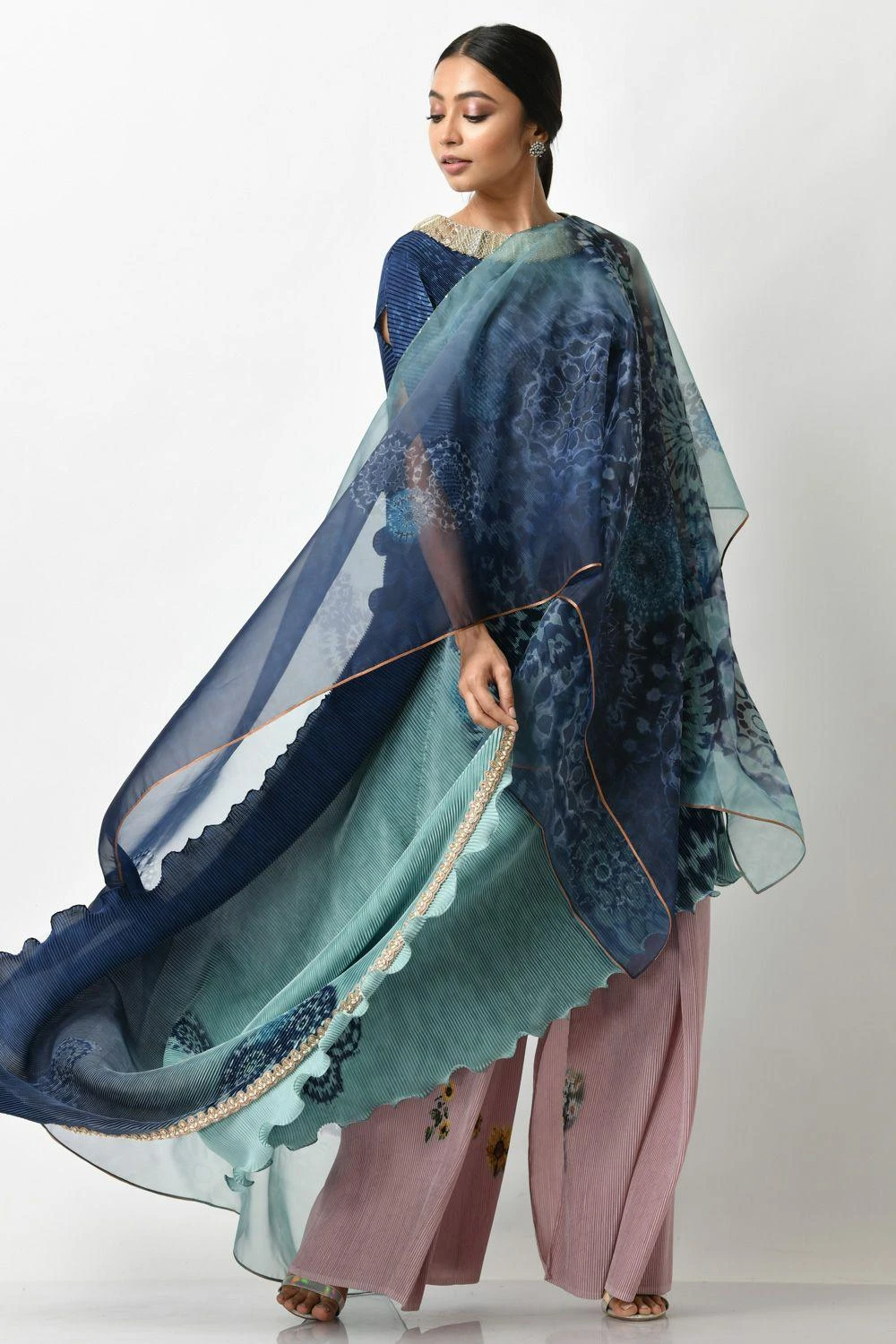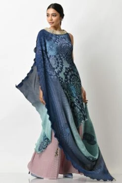 This aqua to navy ombre batik printed drape tunic is micro pleated & is embellished with embroidery & tassel details. Style this breezy piece with a sharara or churidar to complete the look.