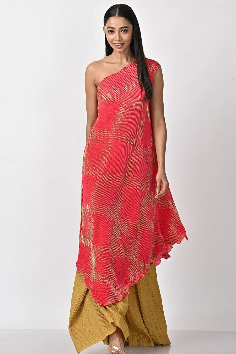 This fuchsia printed one shoulder dress will definitely fetch you a stand out look. This artistic creation is made in pleated polyester & is highlighted with embroidered details. Style this drape with a pair of dangler earrings to complete the look.