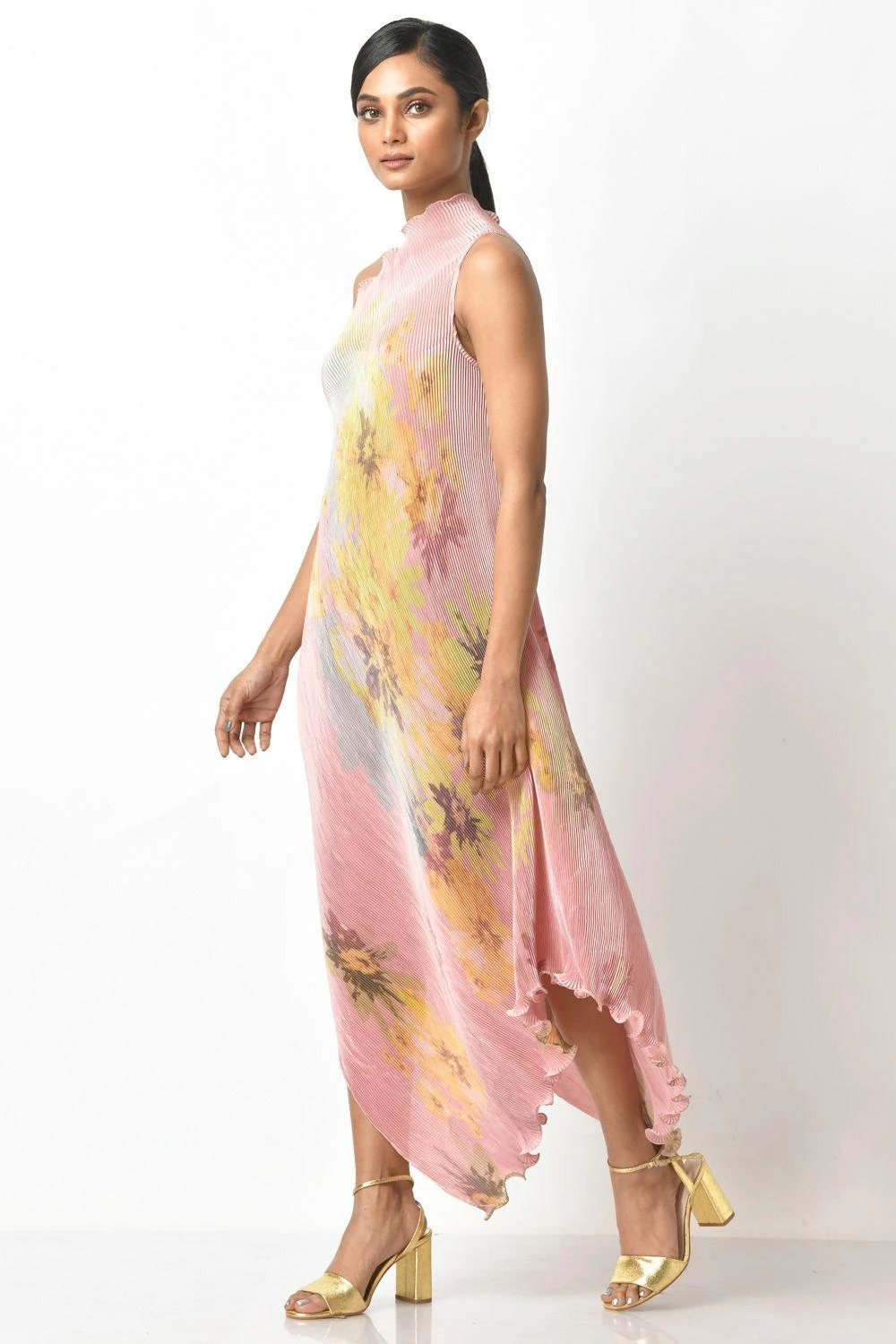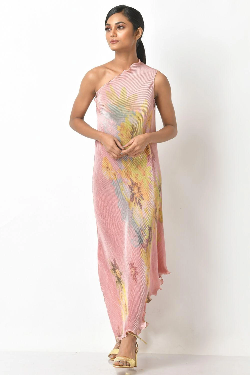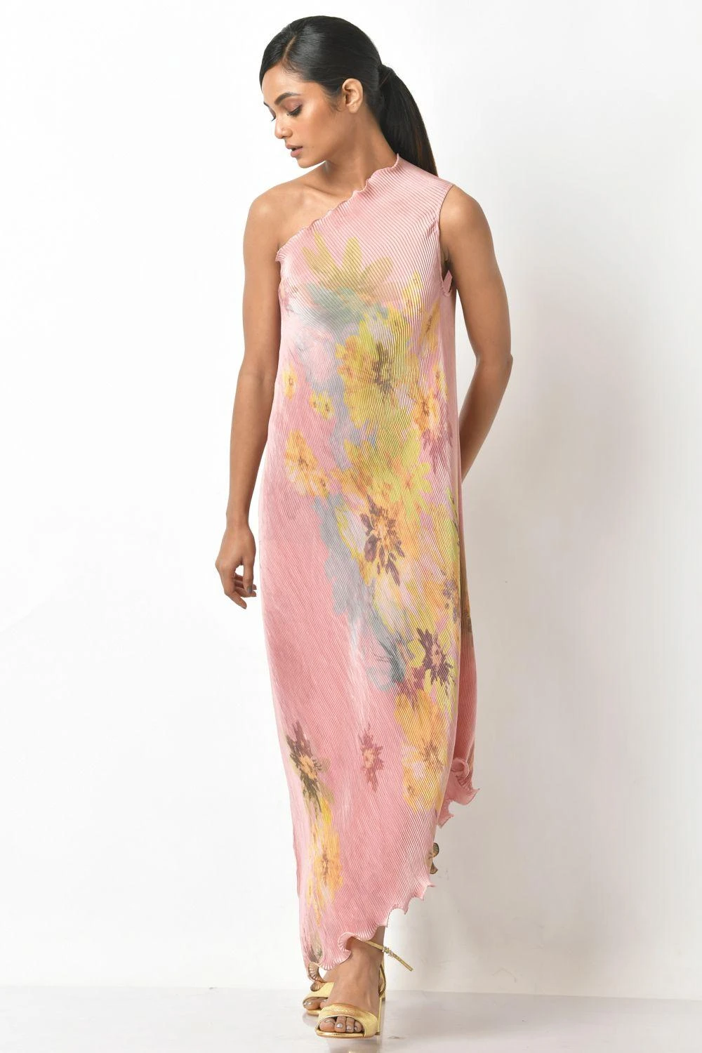 This stunning peach sepia printed one shoulder pleated dress is perfect for summertime soirees. Style it as is or with flared pants for a stylish & graceful look. You can accessorize it with a clutch and statement danglers.