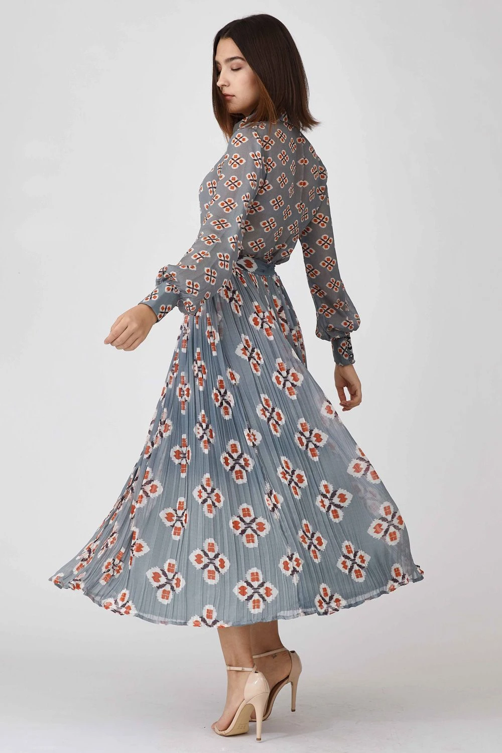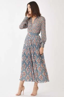 From work to a casual day out, this crinkled blue skirt is a versatile pick. It is cut in flowy georgette fabric with multi-coloured printed motifs. You can style it with a coordinating shirt from KoAi to complete this look.