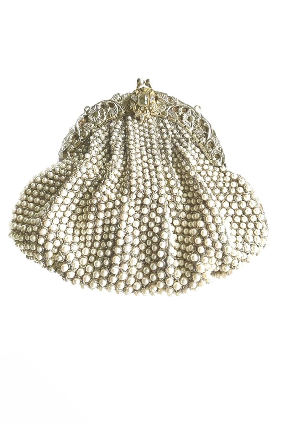 Add a hint of bling to your subtle looks with this understated pouch. This antique classic pouch is created by hand embroidering zardosi and graded pearls in a carved brass frame & is adorned with a vintage piece of diamantÃ’.