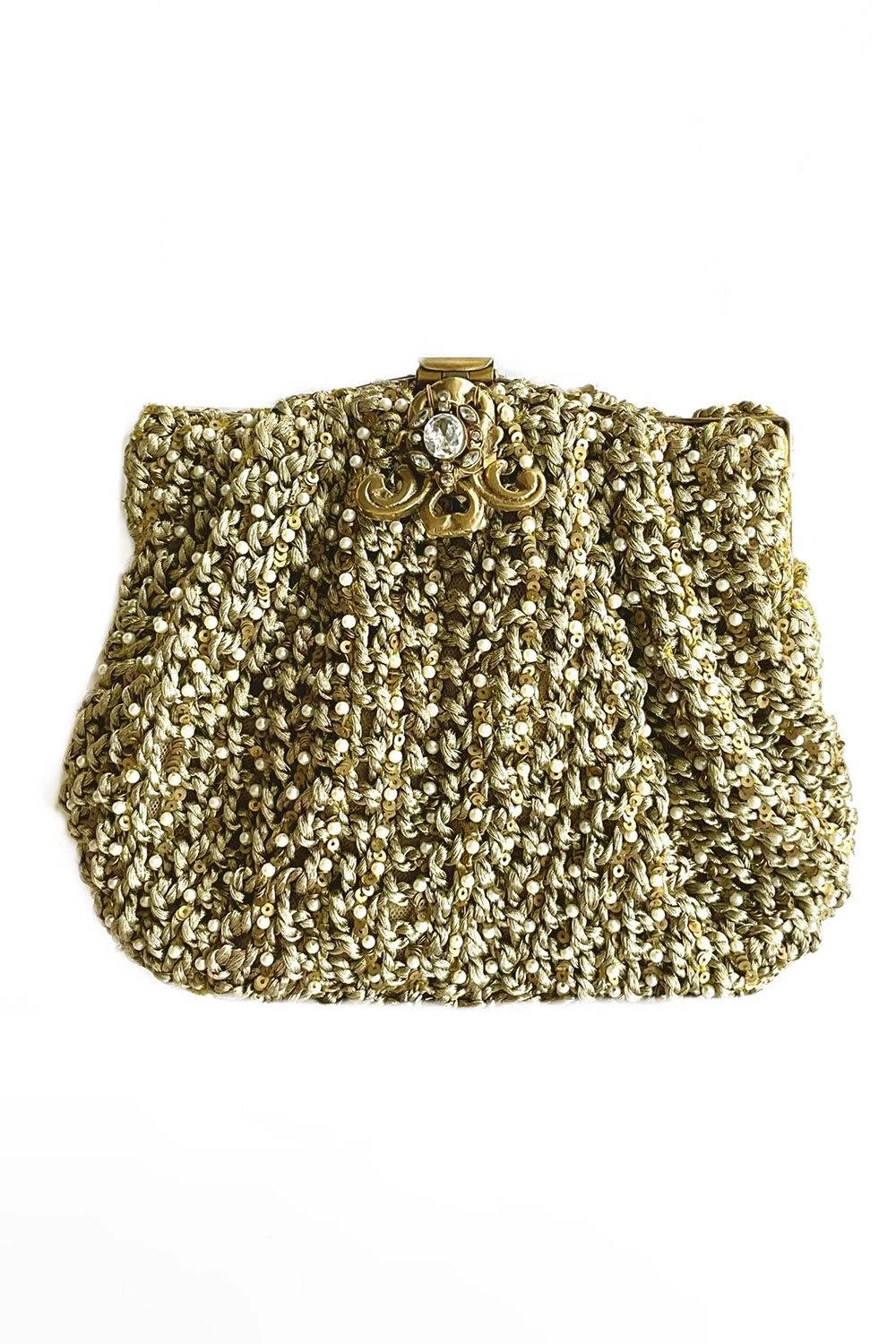 This colette clutch is a framed pouch shaped bag embroidered with intricately woven ari threads & pearls with a diamante brass embellishment. Style this versatile piece with a sari or a sharara set to elevate your look