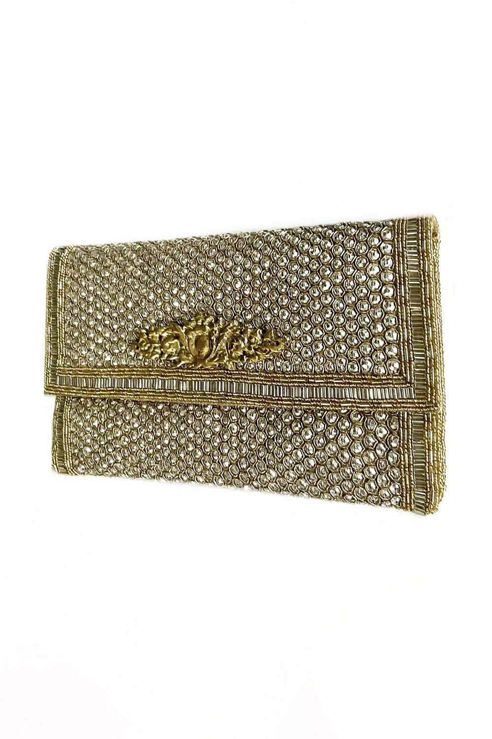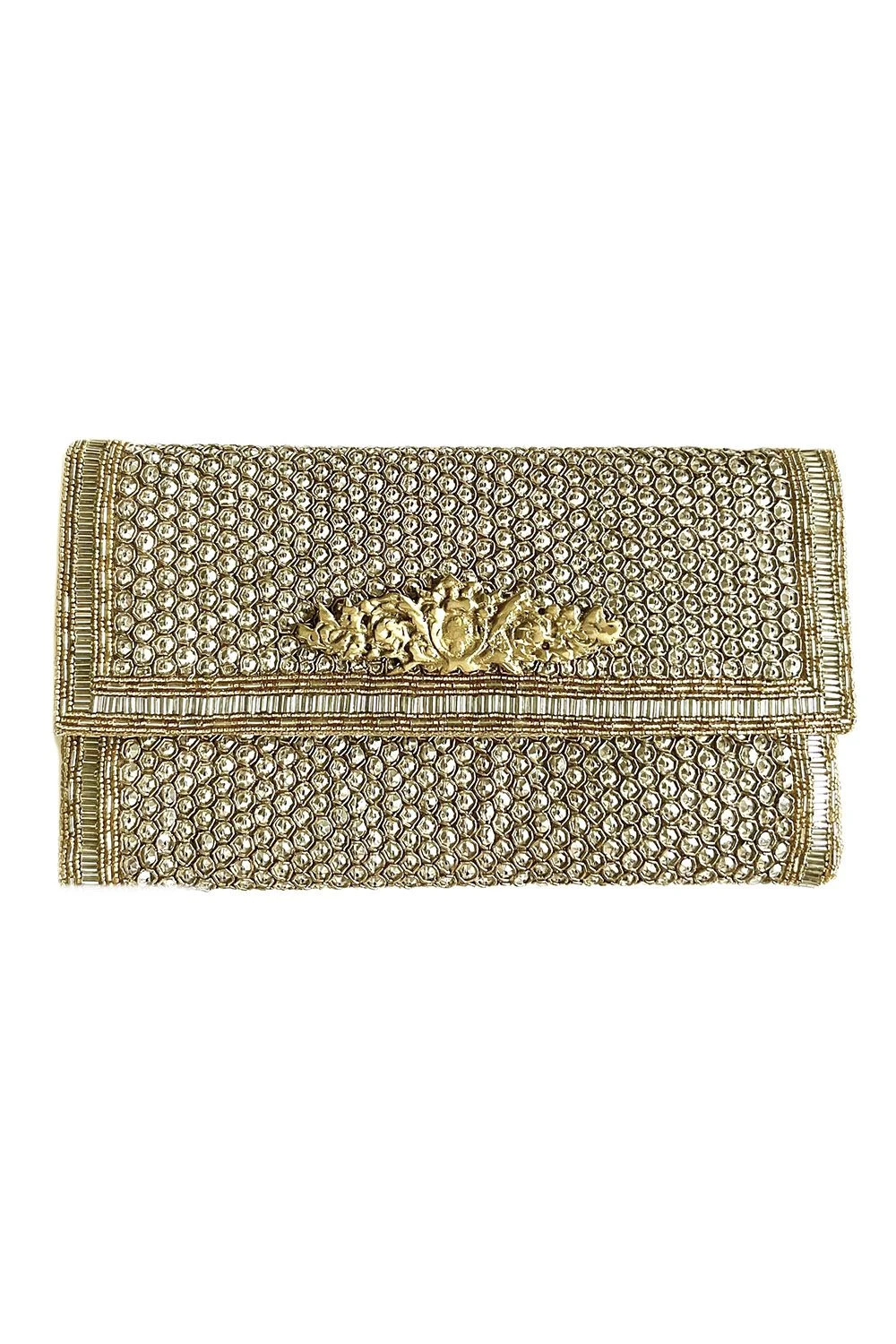 This golden woven bag is adorned with bead details & a statement golden clasp. Style this statement piece with a sharara set or a lehenga for festive occasions.
