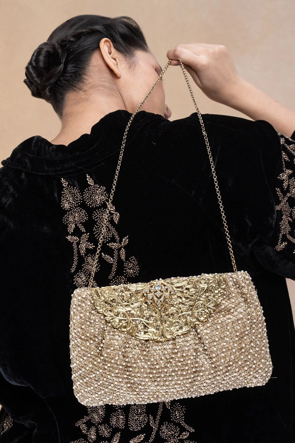 Add a hint of bling to your subtle looks with this understated clutch. This traditional yet modern clutch combines metallic glam with clean lines and is hand embroidered with pure leather trims.