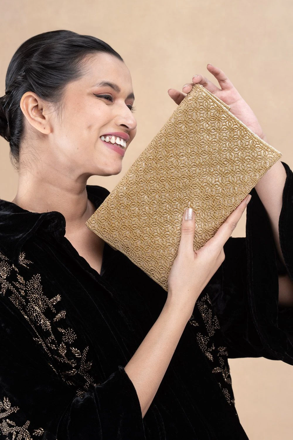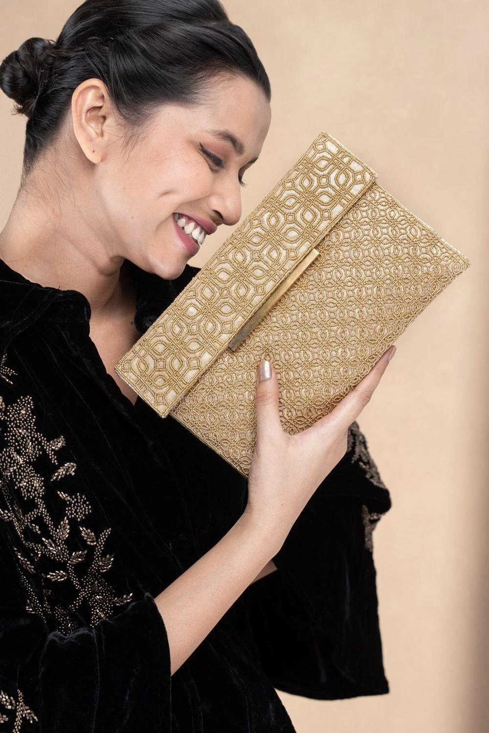 Add a hint of bling to your subtle looks with this understated clutch. This traditional yet modern clutch combines metallic glam with clean lines and is hand embroidered with pure leather trims.