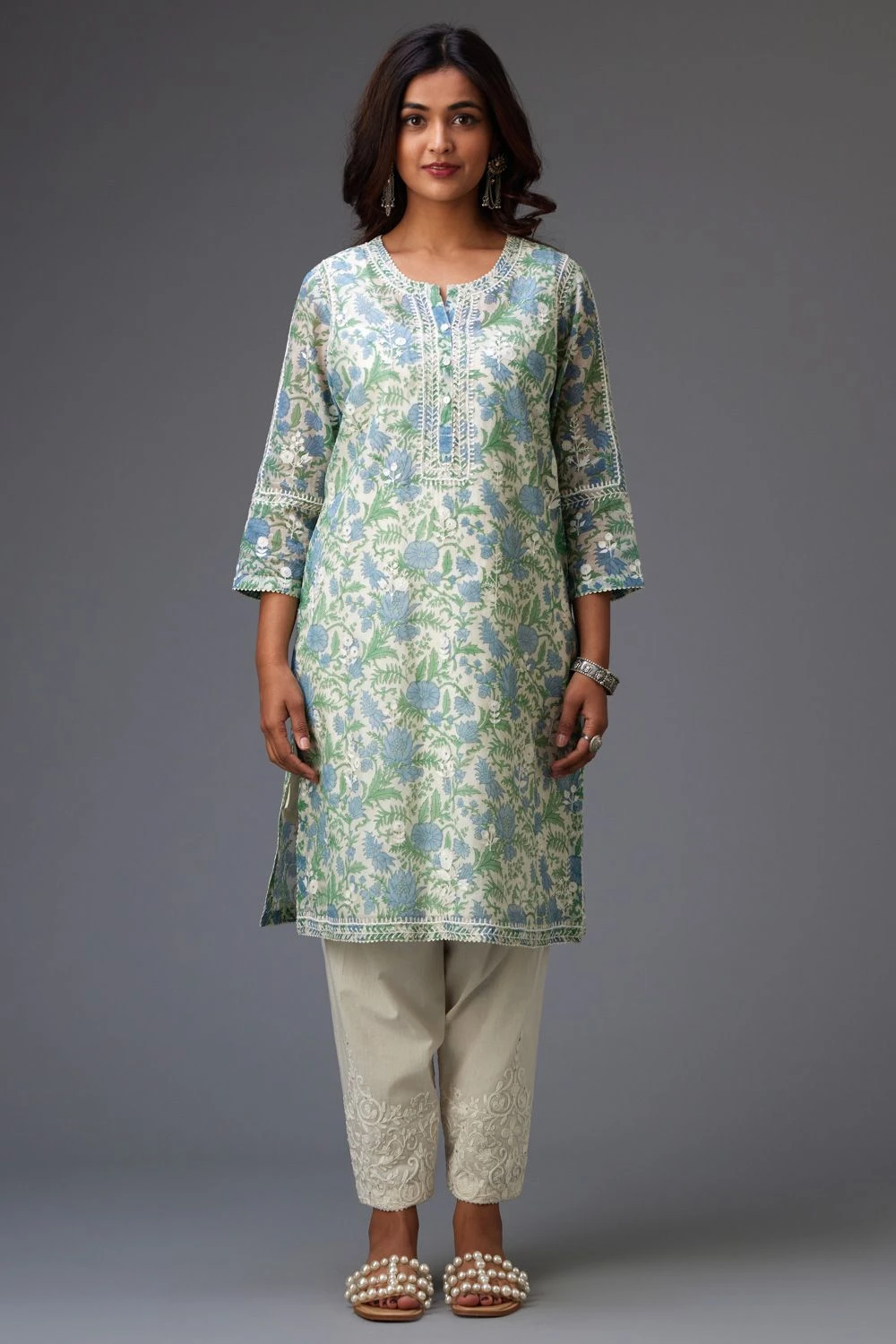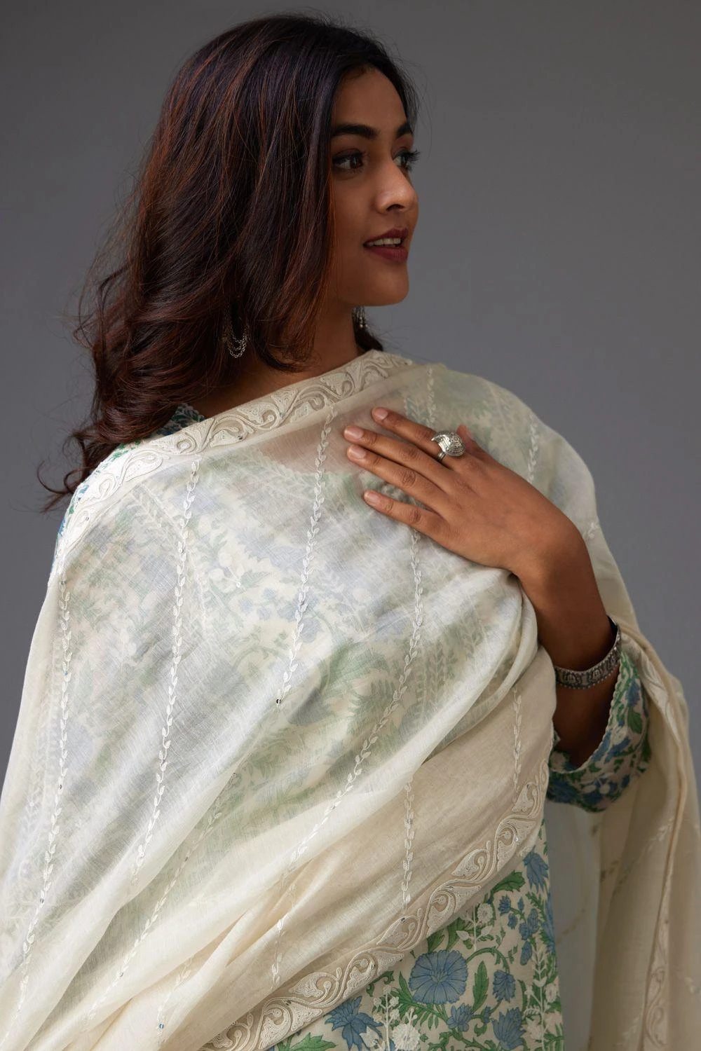 Look effortlessly stylish with this kurta set. Crafted in cotton chanderi, this set features a hand block printed kurta highlighted with silver sequins handwork paired with a dori embroidered dupatta & coordinating pants.