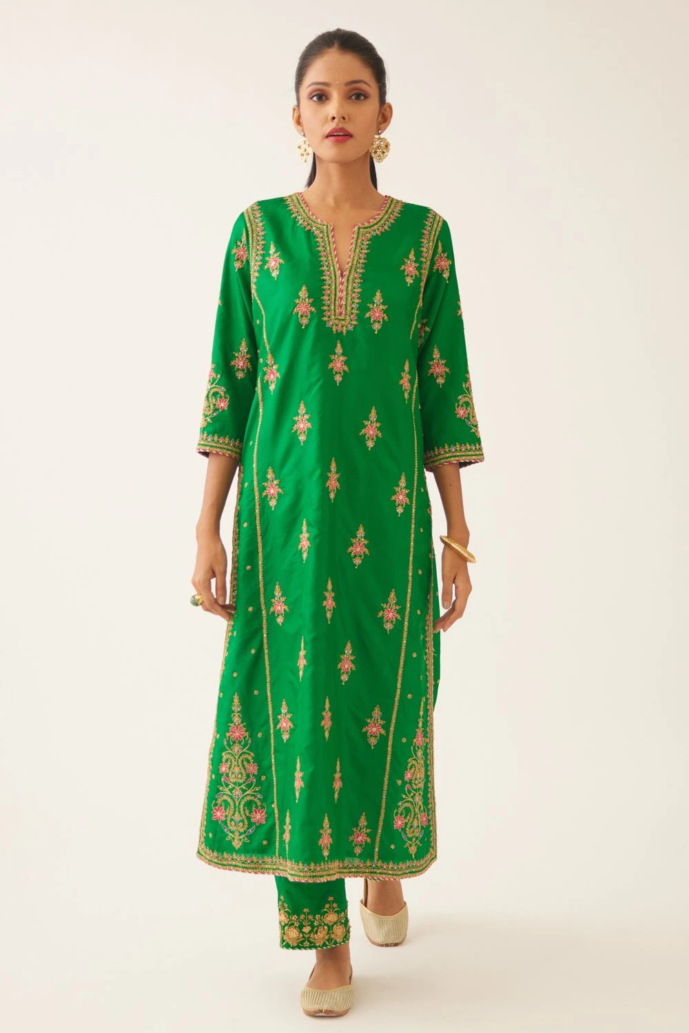 Radiate charm in this Kalidar Kurta. The dori & silk thread embroidery, adorned with beads and sequins, creates an enchanting look. This set comes with coordinating pants & a dupatta, embellished with intricate embroidery and gold zari tassels.
