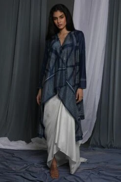 Indulge in luxury with this stunning indigo chanderi printed jacket, adorned with an exquisitely embroidered hemline. Skillfully crafted with meticulous attention to detail, this statement piece effortlessly exudes sophistication and style.