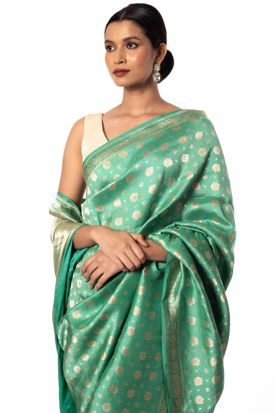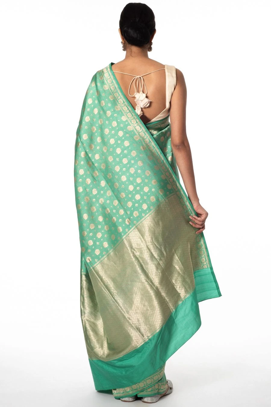 Maximise the life of your wardrobe with this timeless sari. This green brocade silk sari is a trousseau must-have. It is exuberantly enhanced with intricate zari work and is offset with an equally versatile blouse piece.